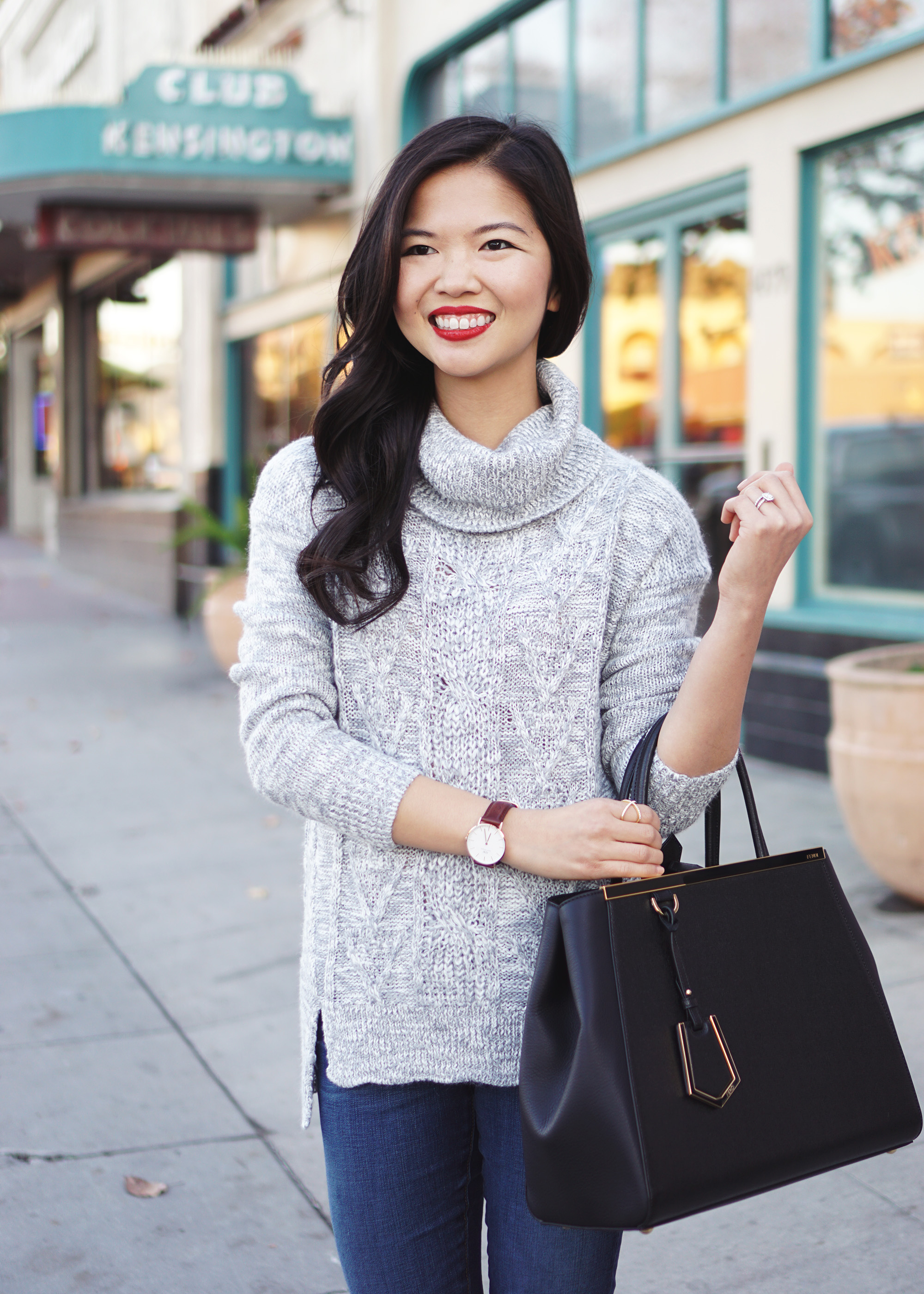 Outfit: BP cable knit turtleneck sweater (40% off and almost sold out!) / AG denim leggings in ‘4 Year Fog’ / Fendi ‘2Jours Elite’ leather tote / Daniel Wellington ‘Classic St. Mawes’ 40 mm watch (c/o) / BP ‘Trolley’ ankle bootie / Makeup: Too Faced Born this Way foundation in ‘Ivory’/ Too Faced Endless Summer bronzer /Anastasia ‘Brow Wiz’ eyebrow pencil in ‘Dark Brown’ / Make Up For Ever mascara/ NARS blush in ‘Dolce Vita’ / NARS velvet matte lip pencil in ‘Mysterious Red’