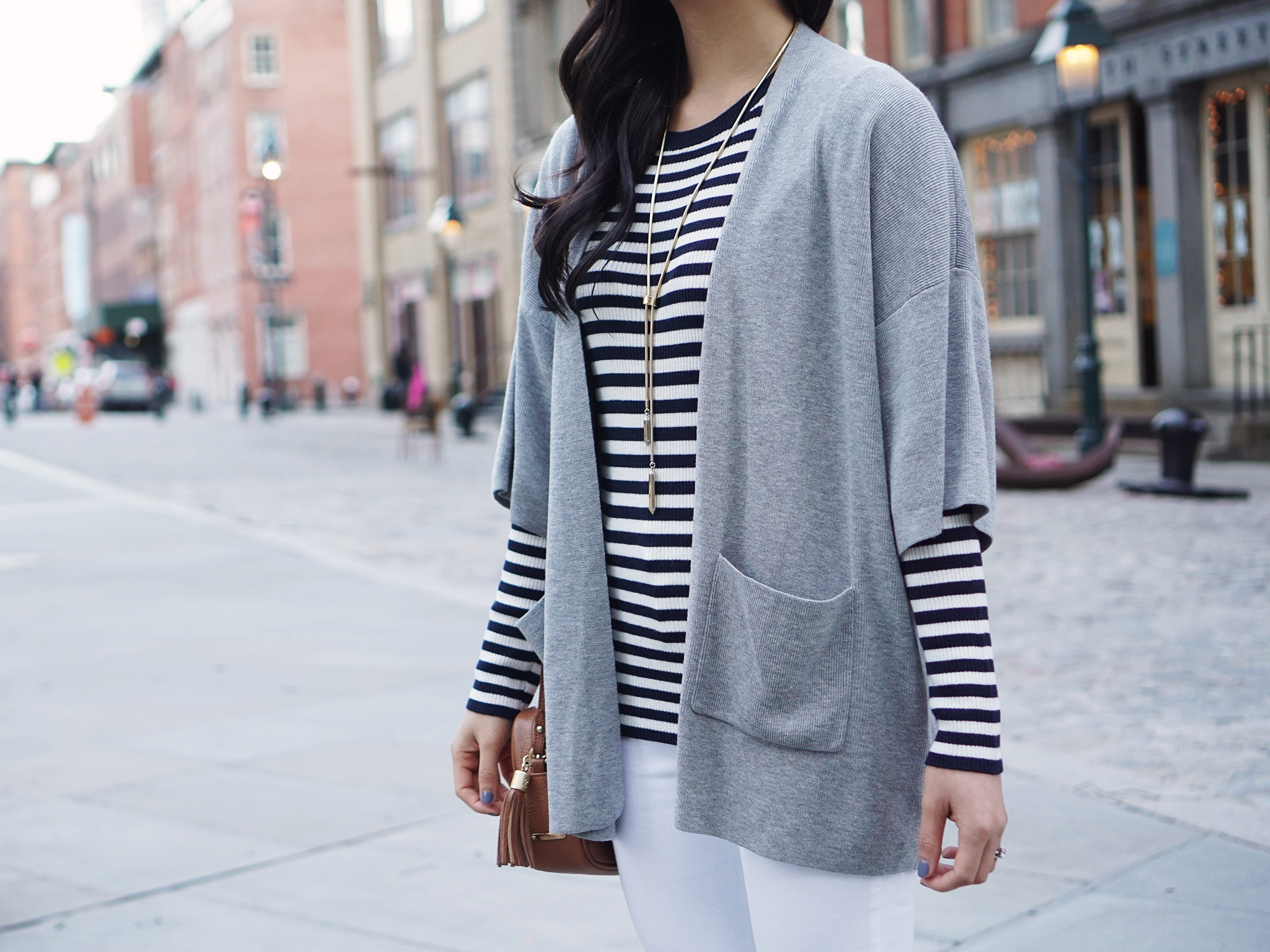 We got our first taste of spring last weekend, so I immediately subbed out my winter coat for lighter layers. A striped sweater (yes, another!) and an open cardigan were surprisingly all I needed to stay warm during the day. I decided to test the waters with this kimono style sweater (which also comes as a black poncho) and love the added dimension it brings when you contrast the short sleeves over a long-sleeved top. Plus anything with pockets is a winner in my book. I’m ready for you, spring!