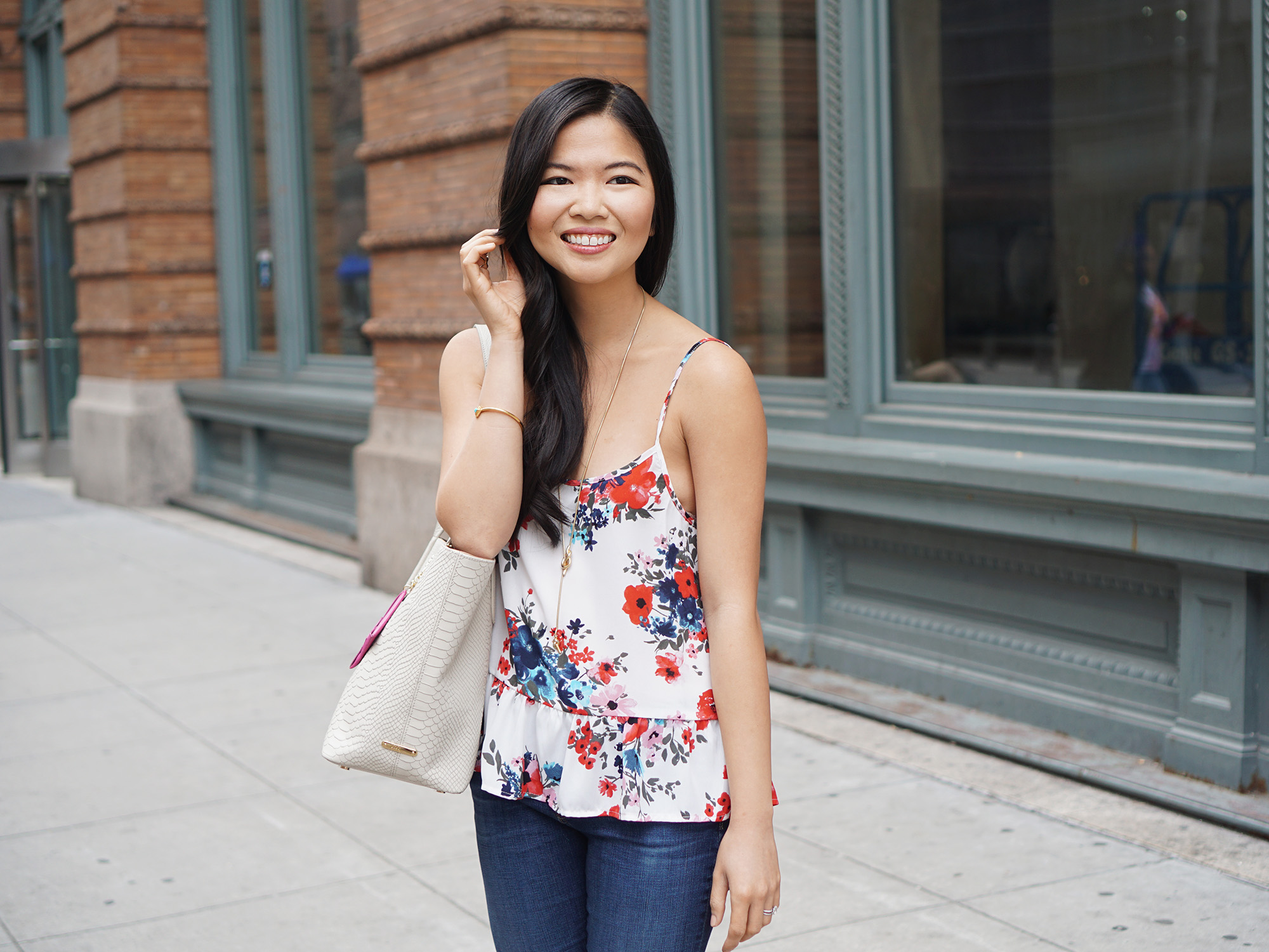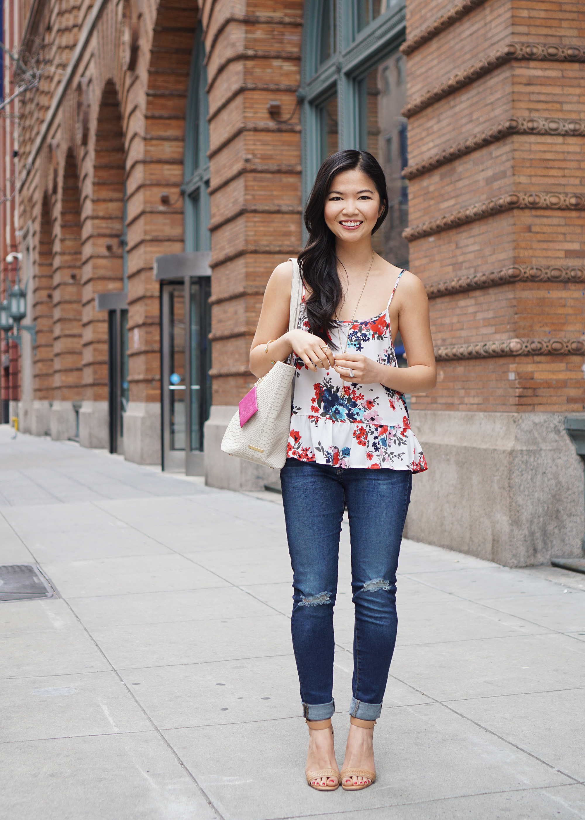 Outfit: Cupcakes & Cashmere ‘Blushing Floral’ peplum tank / AG ‘The Legging’ ankle jeans in ‘4 Year Fog’ / Madewell ‘Knotshine’ necklace / GiGi New York ‘Teddie’ leather tote in ‘Bone’ (c/o) / GiGi New York leather pouch (c/o) (get a free Vaseline Lip Therapy Tin with your purchase!) / Julie Vos ‘Escada’ bangle (c/o) / Pour La Victoire ‘Yaya’ ankle strap heels