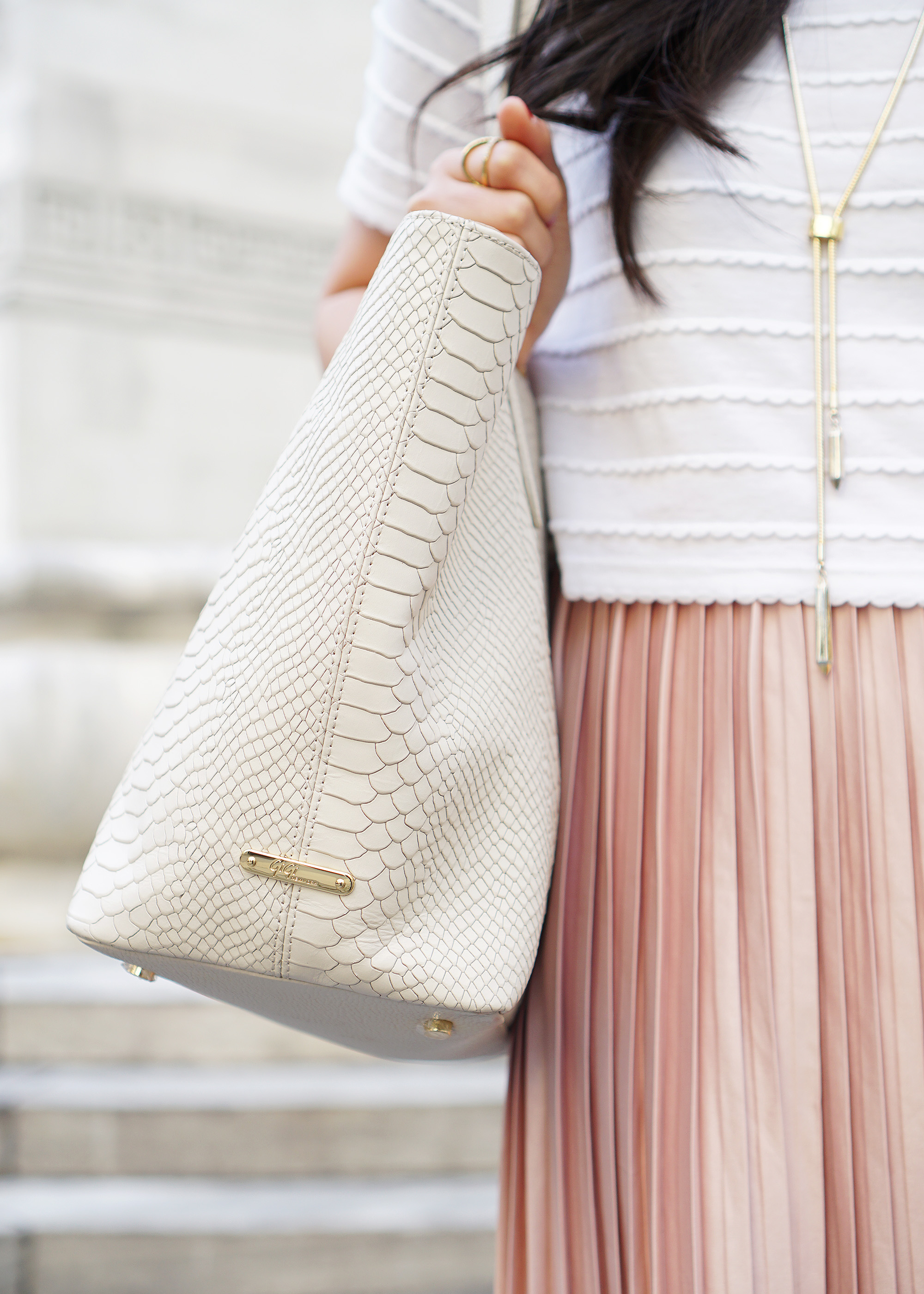 What can I say? When I commit to a season, there’s just no turning back. When I got this pale pink pleated skirt in the mail last week, there was no way I could wait to wear it. I paired it with this cropped t-shirt, which has the cutest mini-scallop detail and is only $15 (it also comes in baby blue!). The outfit is the epitome of my spring uniform and I’m hoping the weather will take a hint soon. Dress for the weather you want, not the weather you have. That’s how it works, right?