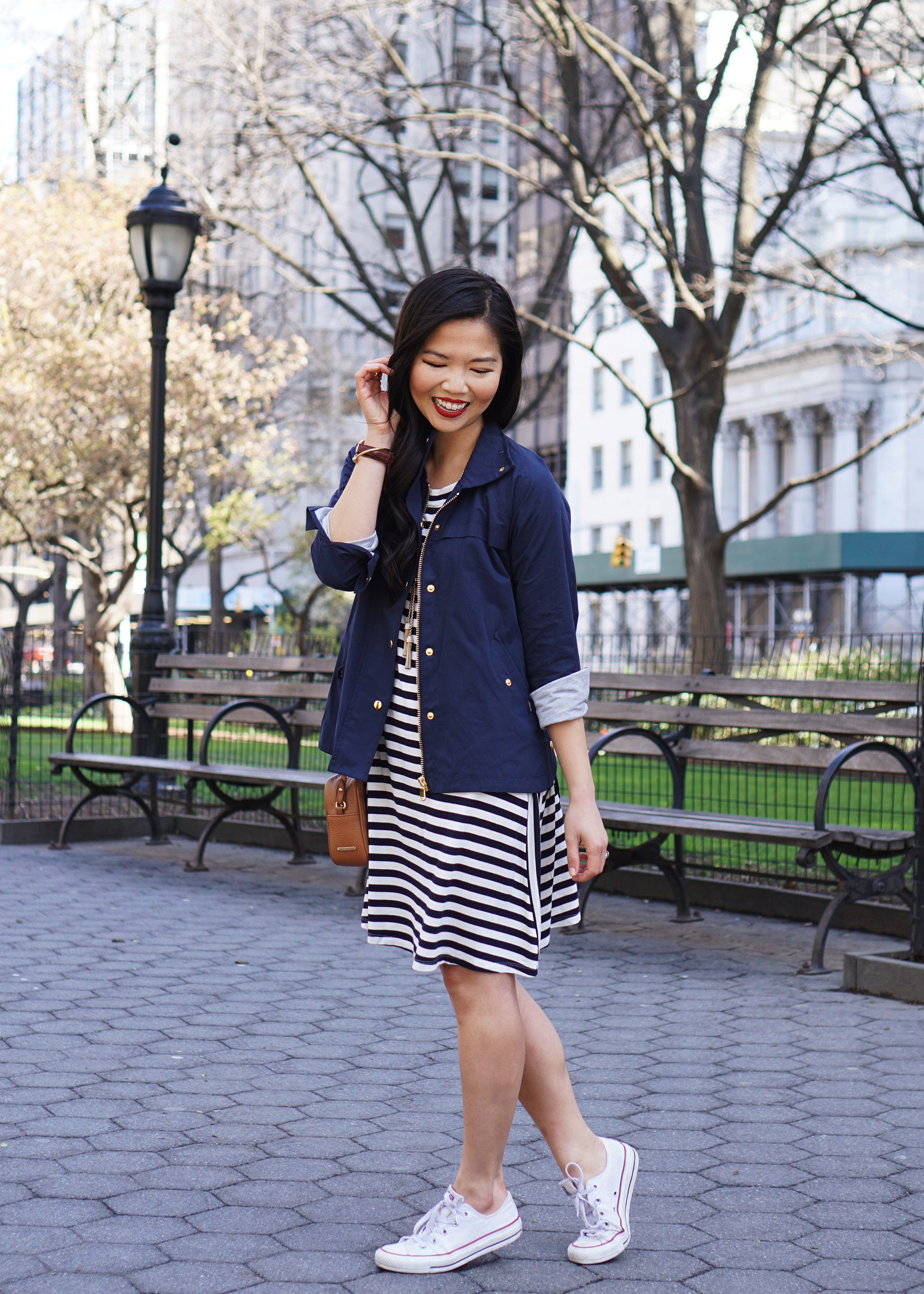 LOFT swing anorak / LOFT mixed striped swing dress / Gold tassel necklace / Julie Vos ‘Escada’ open bangle (c/o) / Gold pave cuff / GiGi New York ‘Madison’ crossbody bag (c/o) / BaubleBar ‘Mason’ pave ring / Daniel Wellington ‘Classic St. Mawes’ leather strap watch (c/o) / Converse ‘Chuck Taylor’ low sneaker