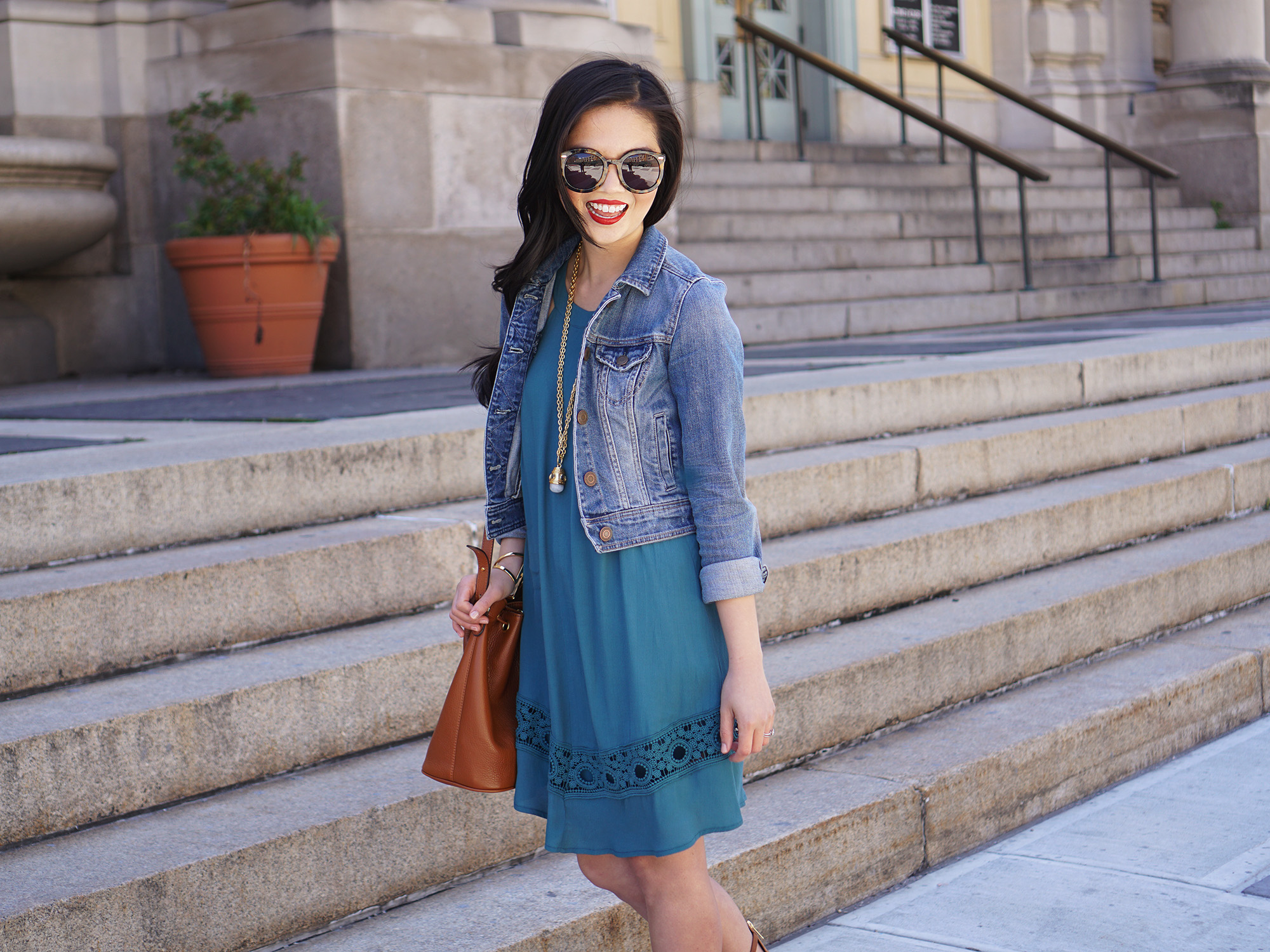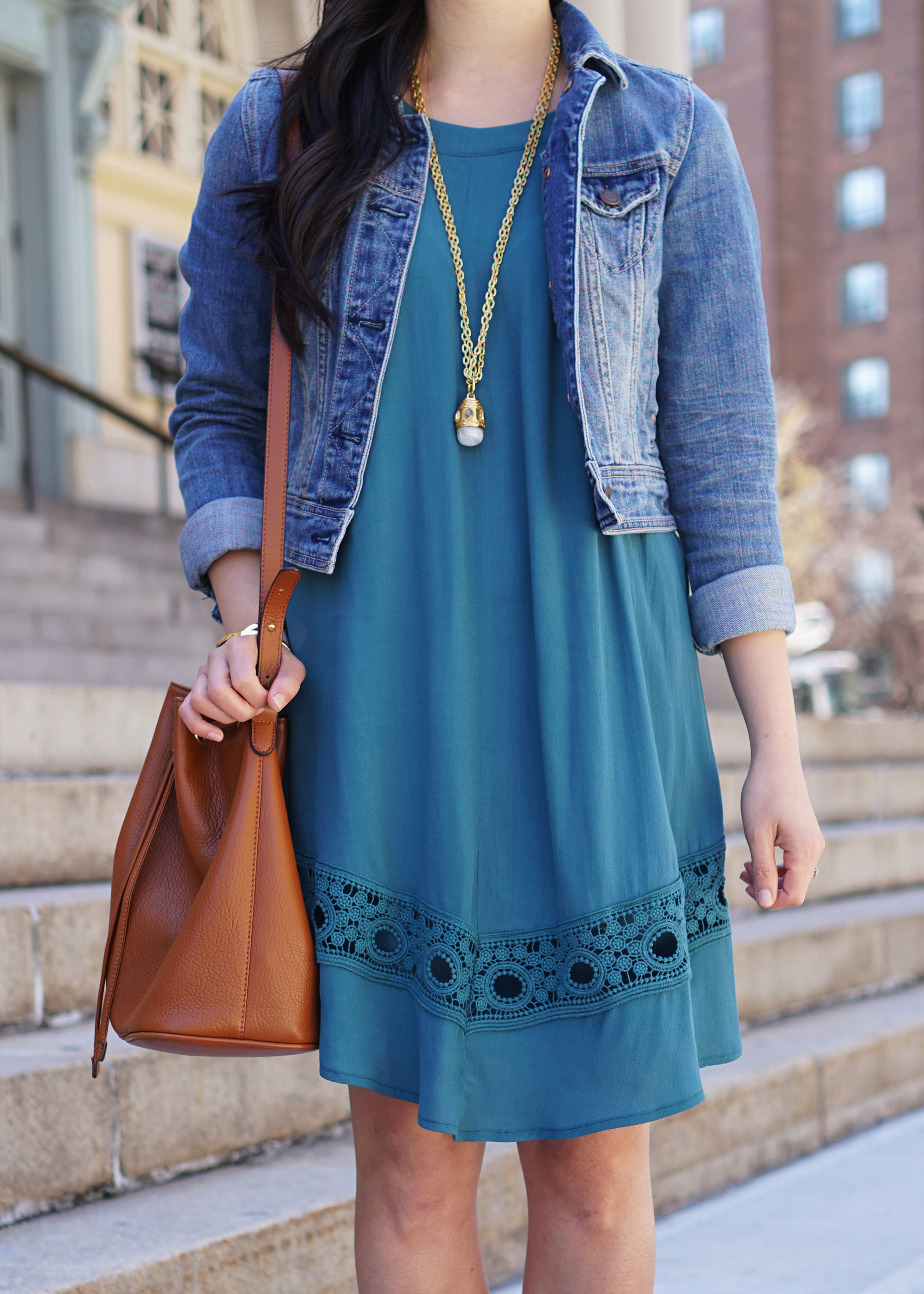 Outfit: ASTR crochet inset shift dress (sold out, but similar top here) / Denim jacket / Karen Walker ‘Super Duper’ sunglasses / Julie Vos ‘Baroque’ pendant necklace (c/o) / Bucket bag / Brown suede gladiator sandals / Makeup: Too Faced Born this Way foundation in ‘Ivory’ / Bobbi Brown bronzing powder in ‘Golden Light’ / Dior ‘2-in-1 Prime & Conceal’ in ’02’/ Anastasia ‘Brow Wiz’ eyebrow pencil in ‘Dark Brown’ / Make Up For Ever mascara / NARS blush in ‘Dolce Vita’ / NARS velvet matte lip pencil in ‘Cruella’