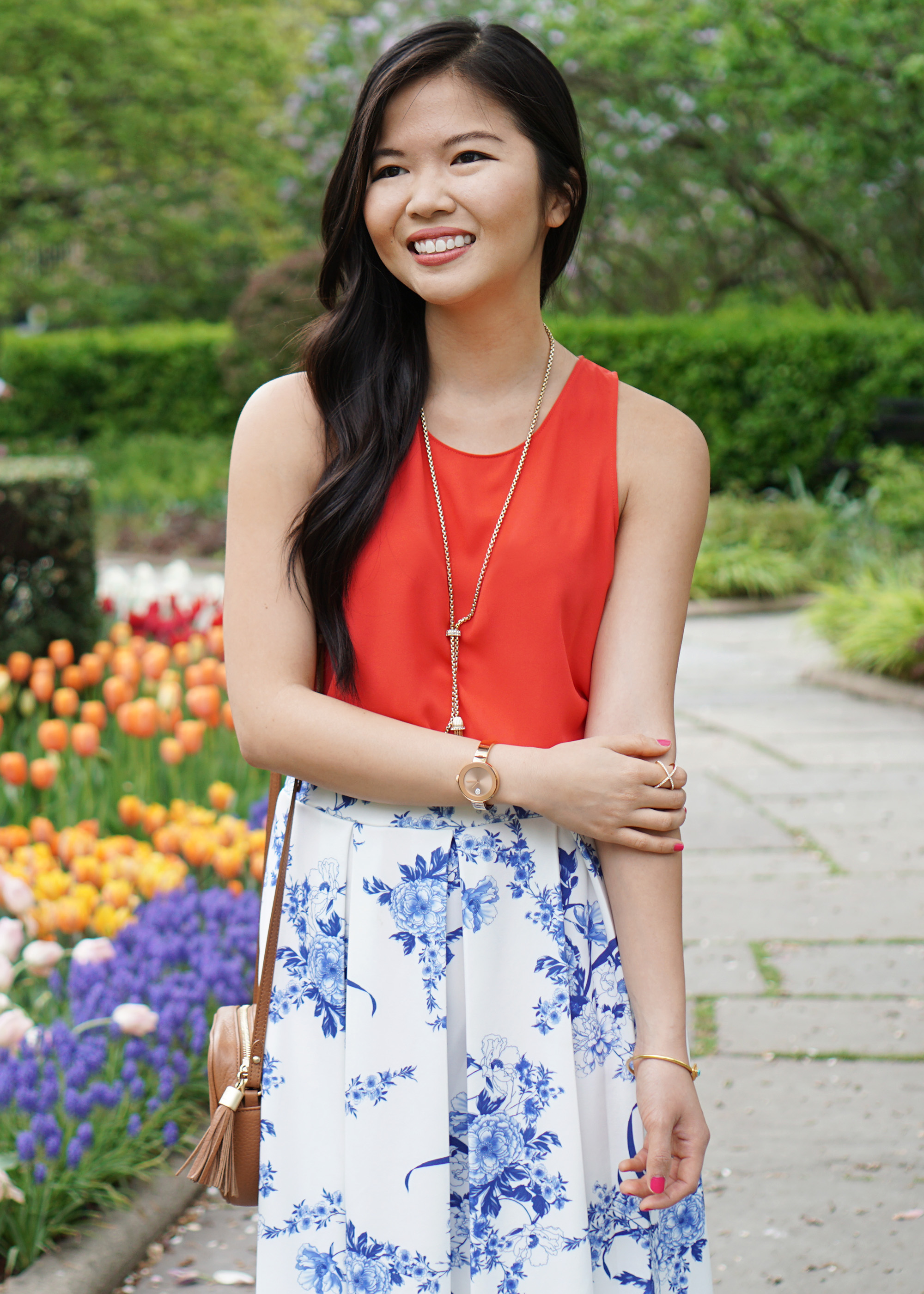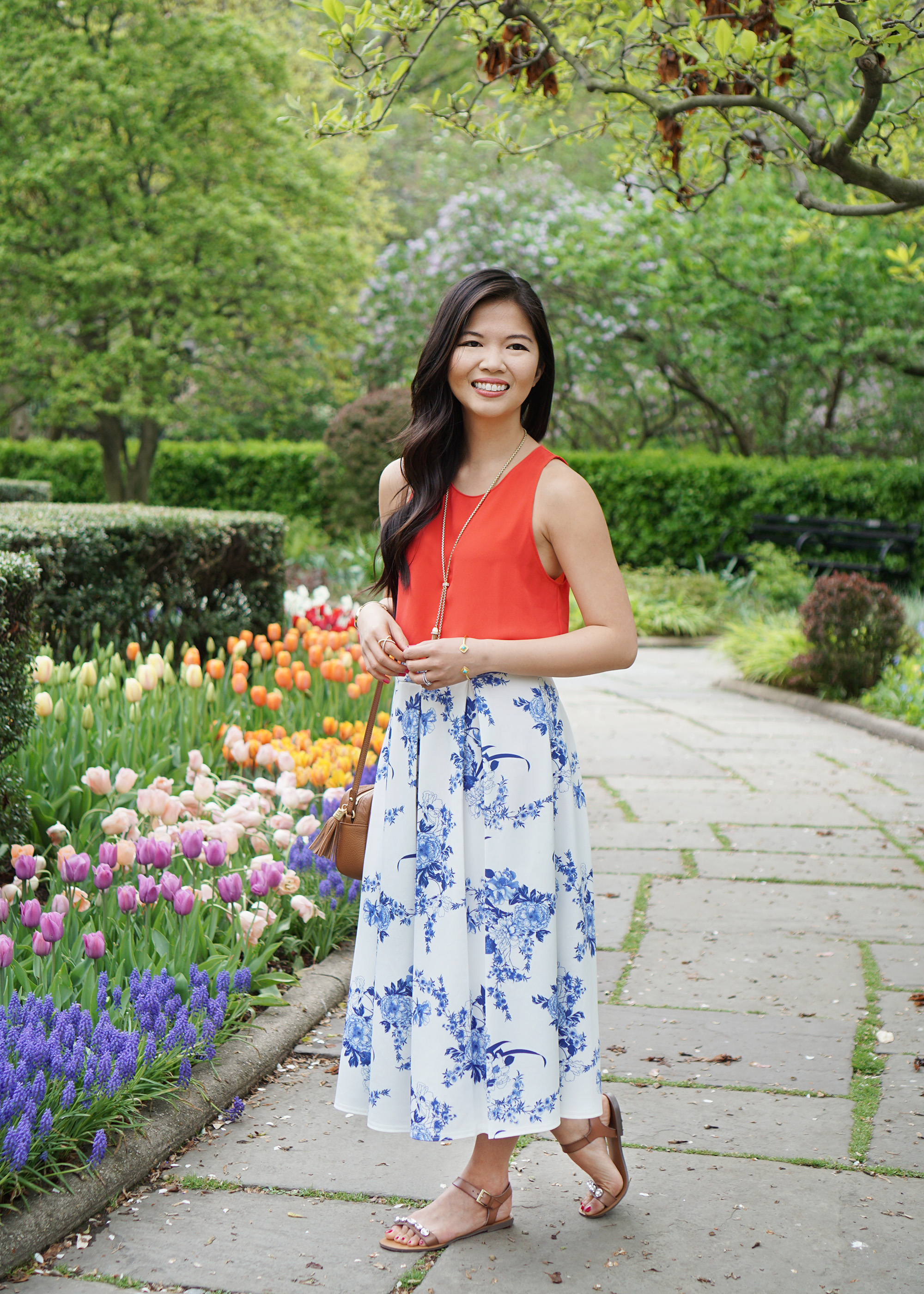I wore this floral print midi skirt last month in a blue on blue outfit (seen here), but this time around, I wanted to add a major pop of color. Cue this fluid tank top – it’s only $34 and comes in a bunch of different colors, but the bright tomato red is a standout.