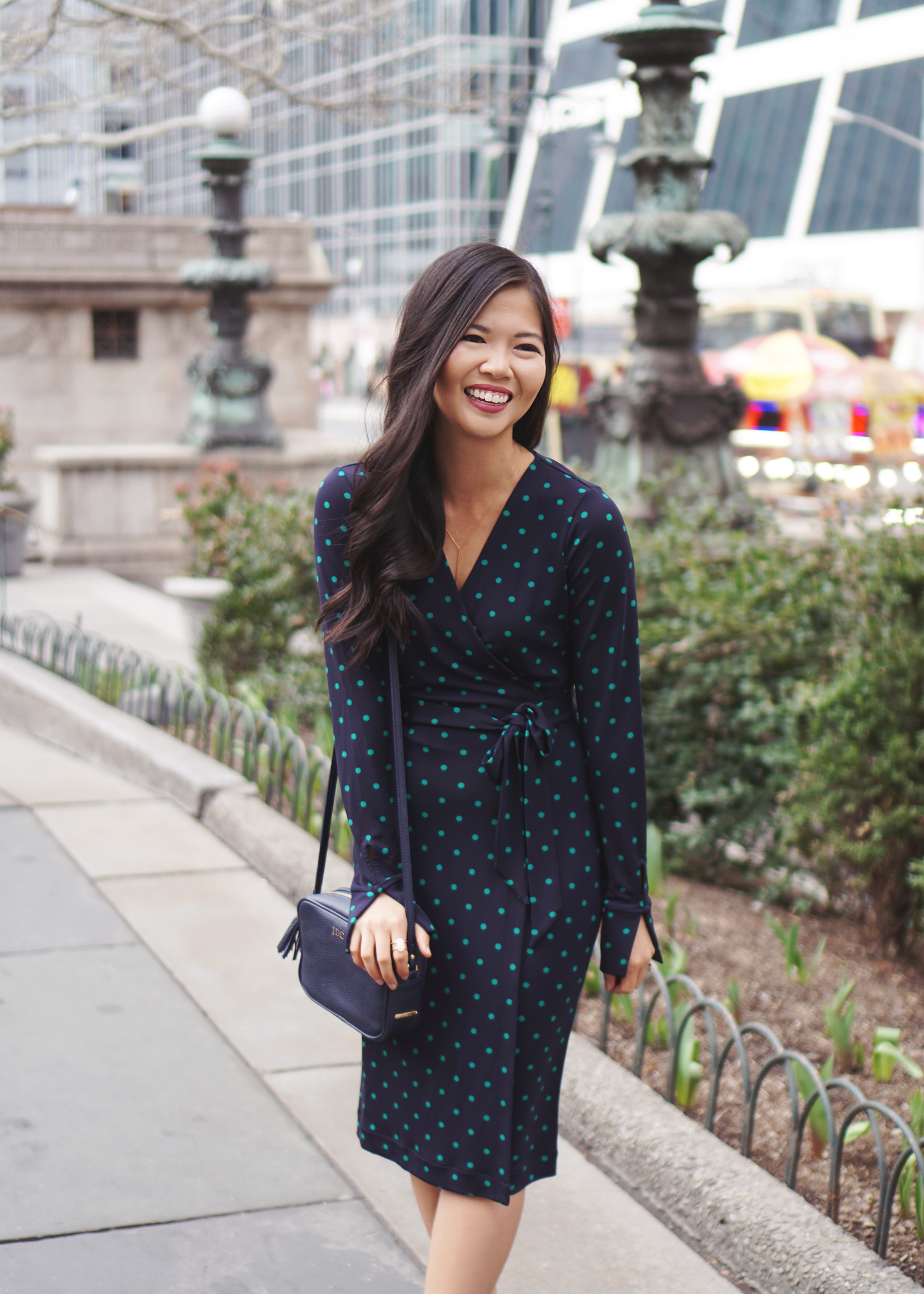 Mondays just always seem to be jam packed with meetings on meetings on meetings. And I would be lying if I said that I look bright-eyed and fresh-faced and so excited to be jumping from conference room to conference room all day. The silver lining to a busy day is that I get to show off my outfit to as many co-workers as possible (don’t judge me). That’s why I like to start the work week off with an outfit that makes me feel good. This wrap dress from Ann Taylor does exactly that.