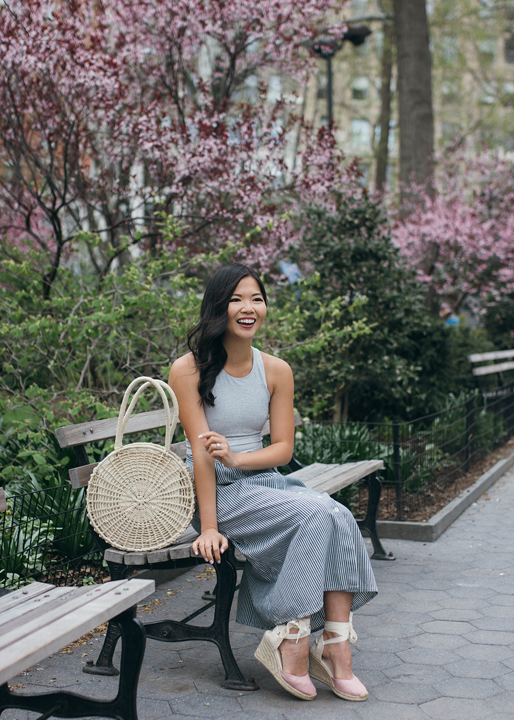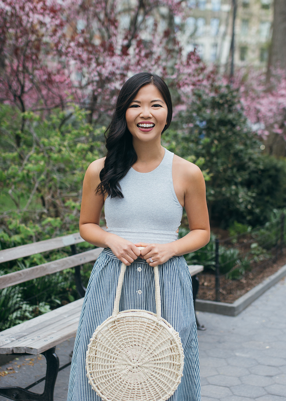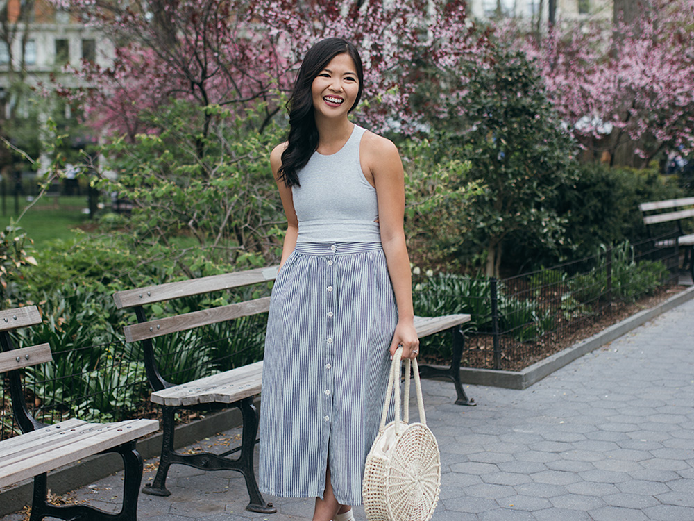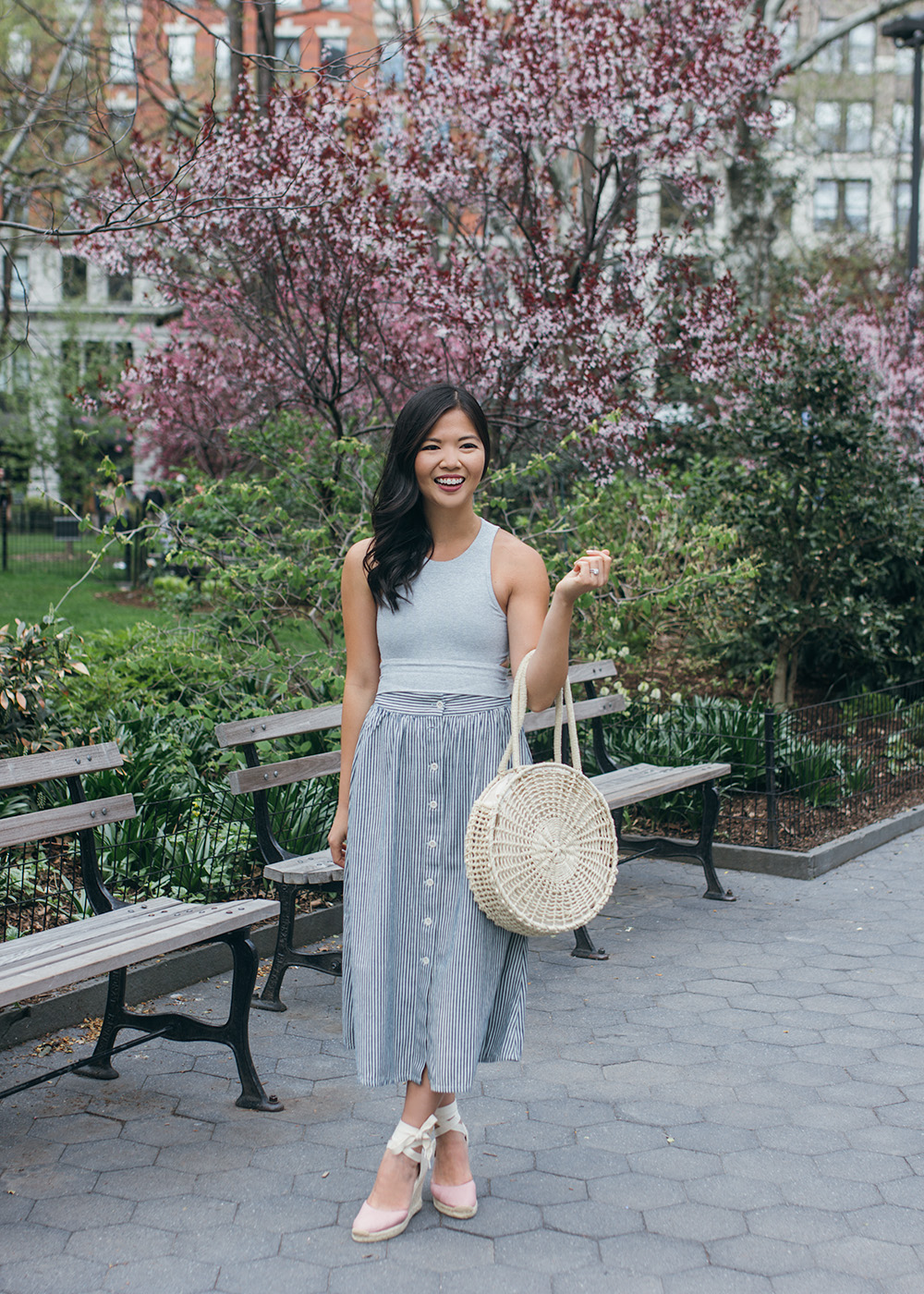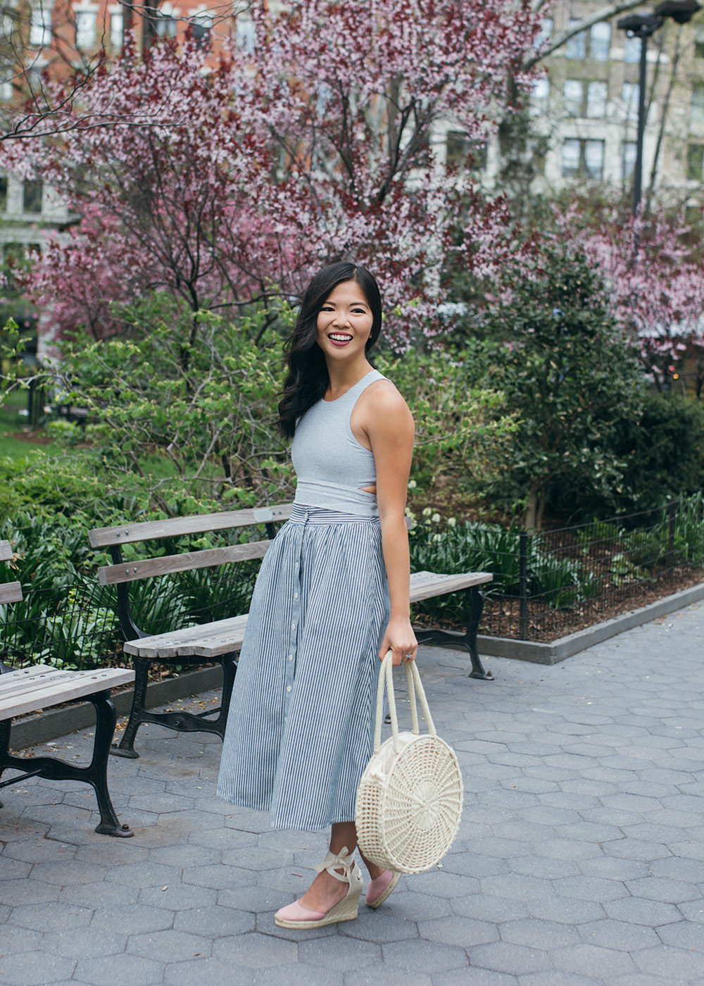 Crop Top (comes in seven colors!) / Striped Mid Skirt (also available in a solid chambray) / Straw Circle Tote (similar here and here) / Pink Espadrille Wedges