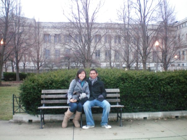 I remember the very first trip James and I took together as a couple – it wasn’t until four years after we started dating! (We were poor college kids and this was a big deal!). We went to Chicago in the throes of winter (now I understand why tickets were so cheap) and I remember wanting to get a photo together outside of the Field Museum. There was no one around since it was FREEZING, but I saw two park benches across from each other and had an idea.