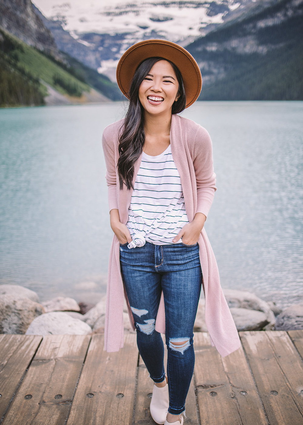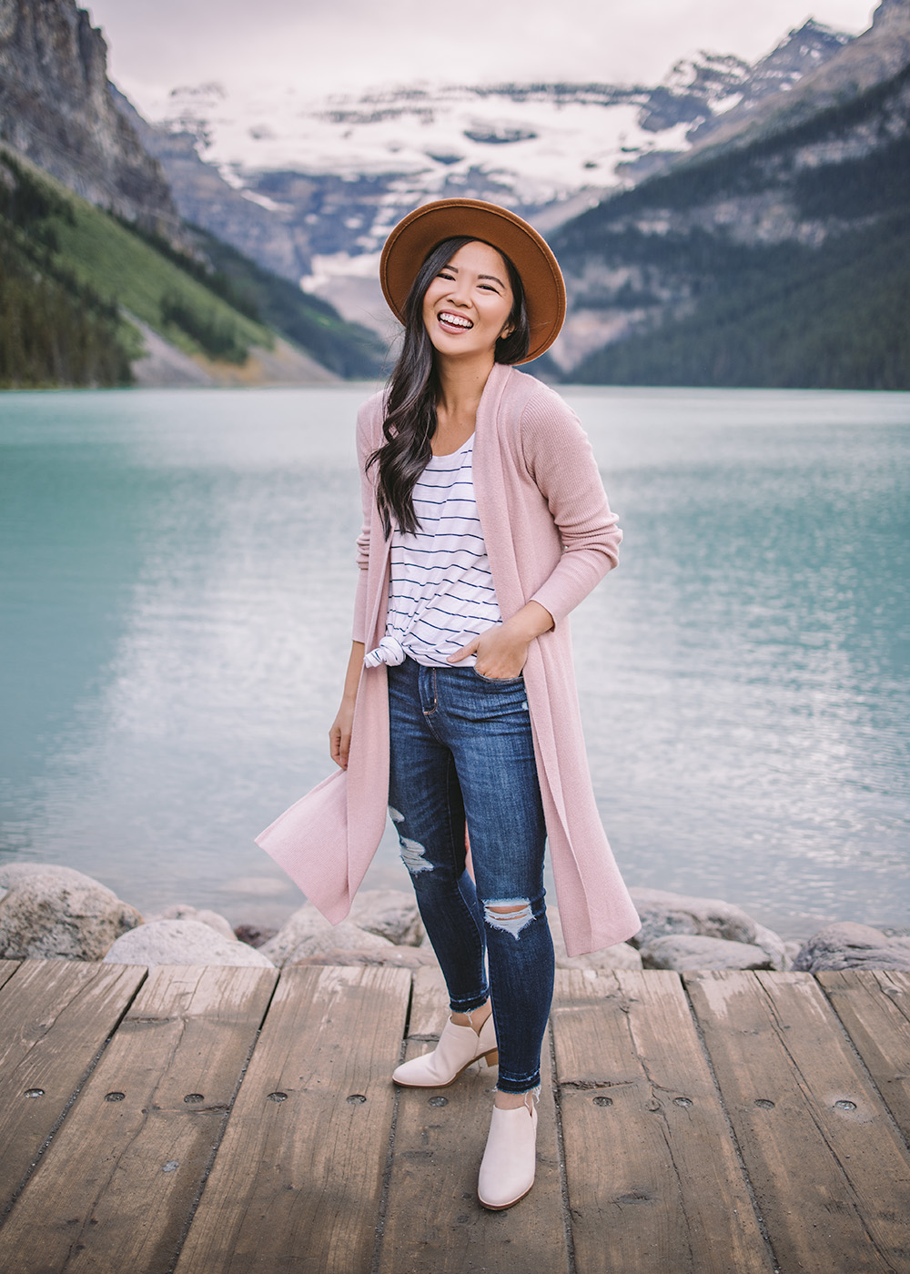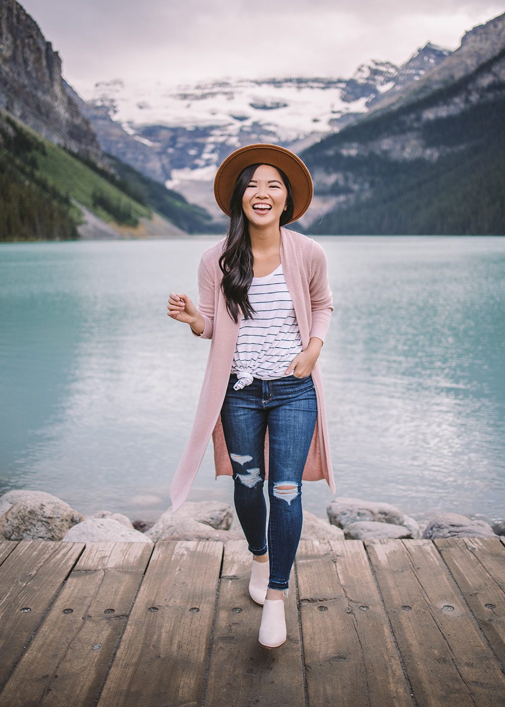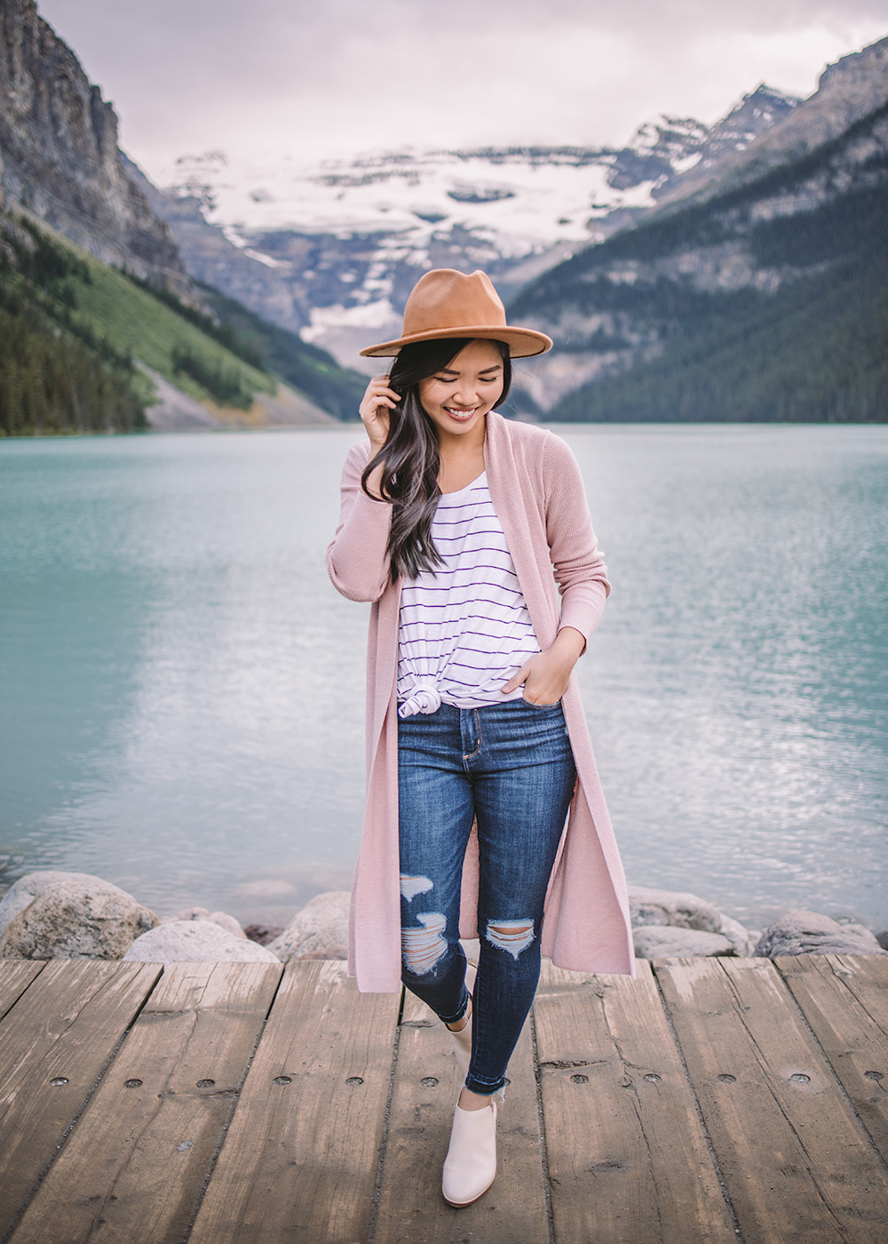 Truth be told, one of the reasons why we visited Banff in July was because it was a welcome escape from the heat – and an opportunity to start wearing some fall layers! I picked up this blush cardigan during the Nordstrom Anniversary Sale, but I was most excited for this felt hat (only $16) and these ankle booties (only $35). Lots of more Banff pics to come, with a full travel guide coming soon!