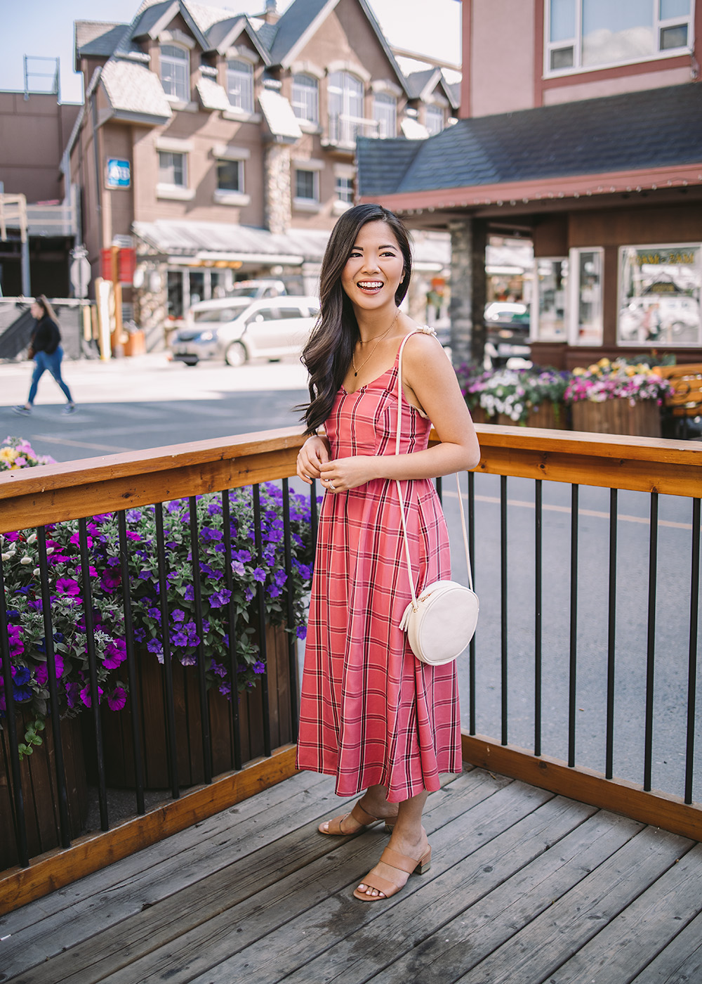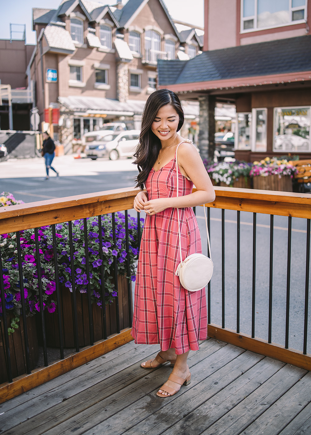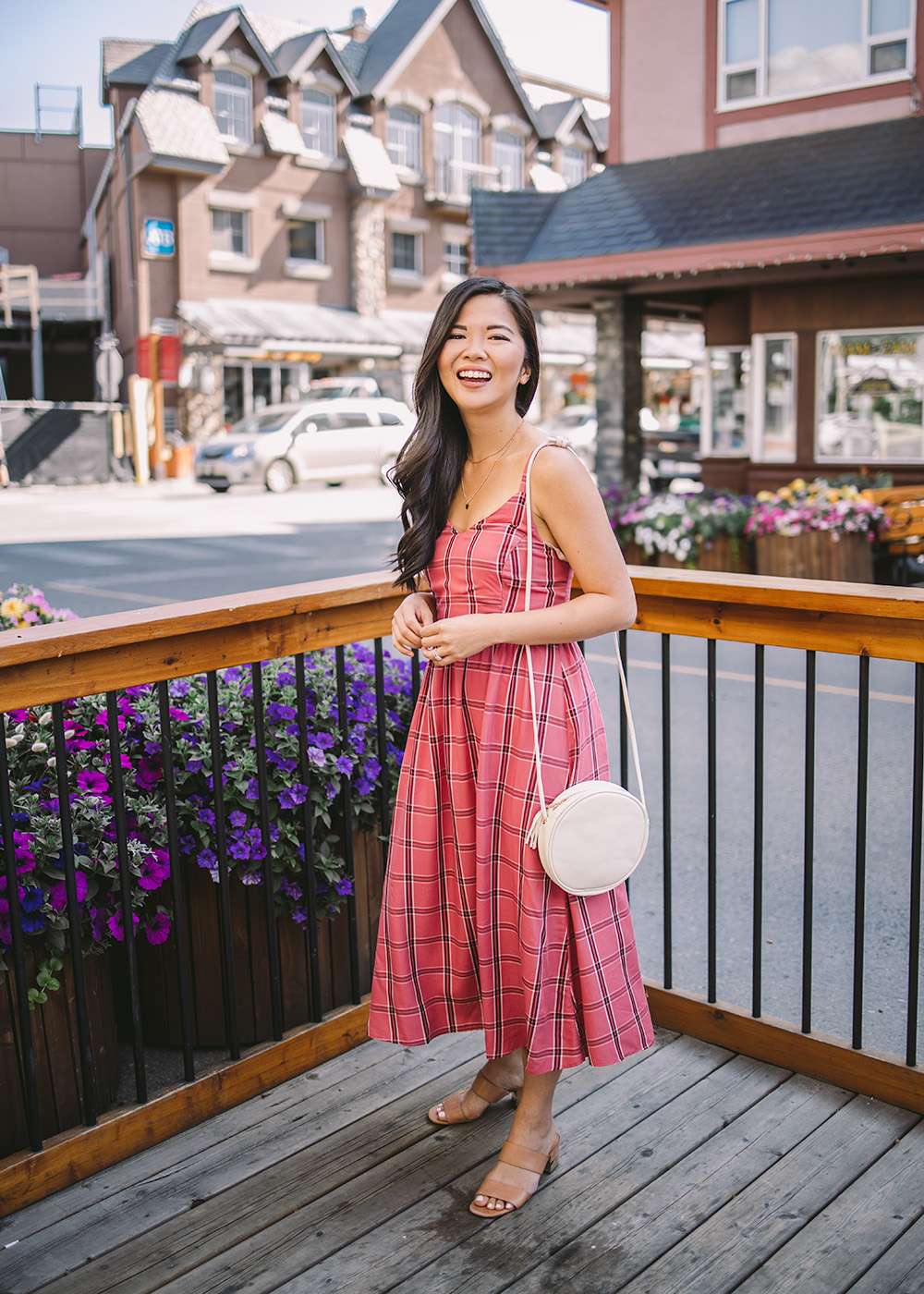 Pink Plaid Midi Dress (originally $40, currently on sale for $26) / Circle Crossbody Bag (only $14) / Tan Leather Mules