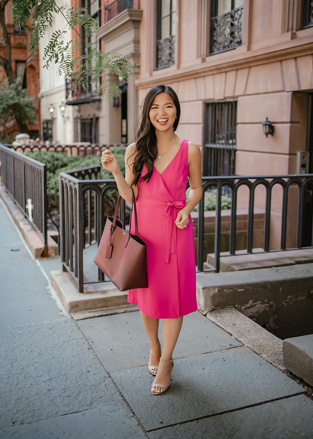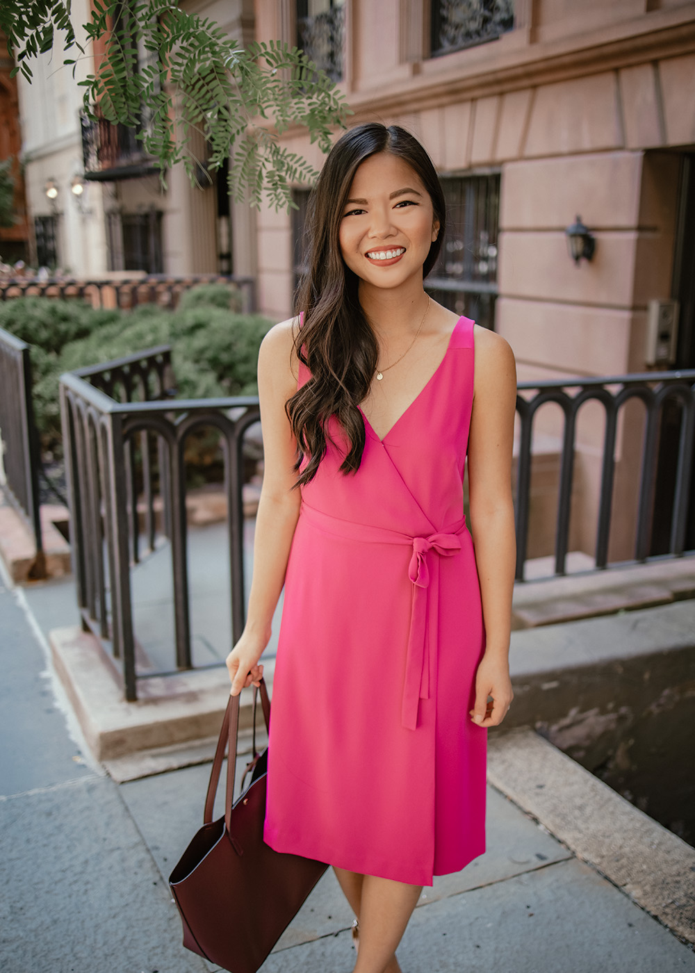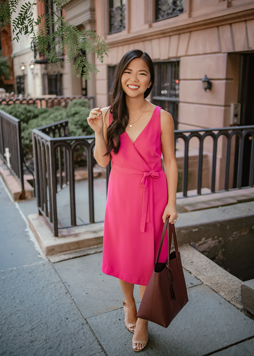 Pink Wrap Dress (c/o and 40% off this weekend!) / Delicate Gold Disc Necklace (only $10 for a set of 3) / Burgundy Tote Bag (also comes in taupe and hunter green) / Nude Strappy Heels / NARS Matte Lip Pencil in Walkyrie