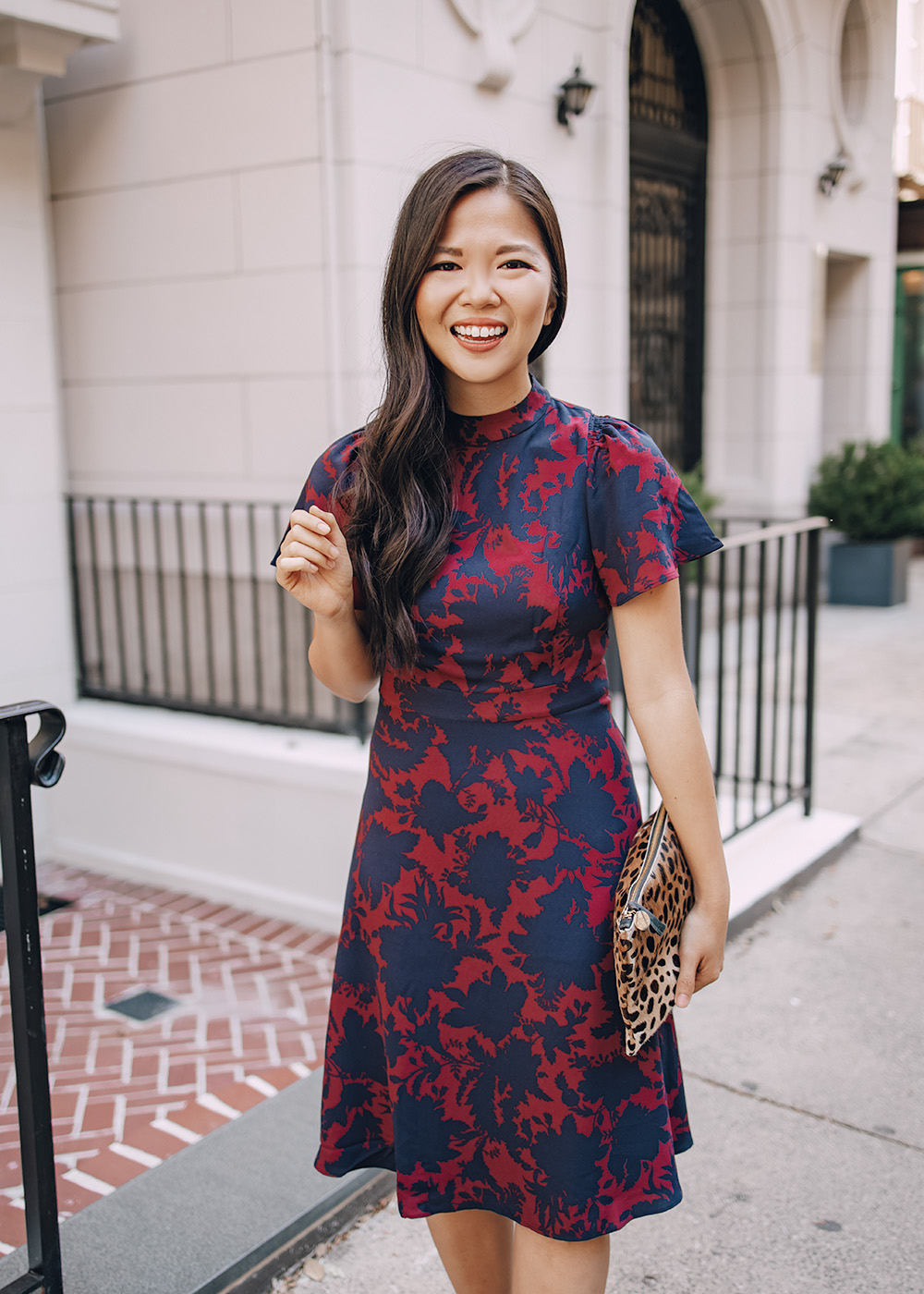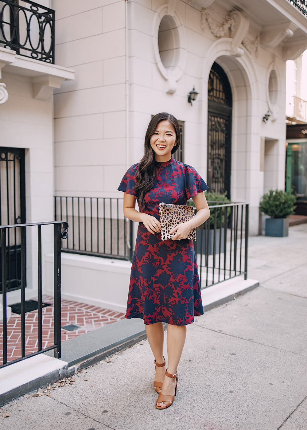 My favorite style move as of late: throwing a skirt over a dress (I’ve been doing that a lot with this camel midi skirt – it goes with everything!). It’s a simple, but surefire way to get more wear out of your favorite dress and this fall floral print is definitely an all-time favorite!