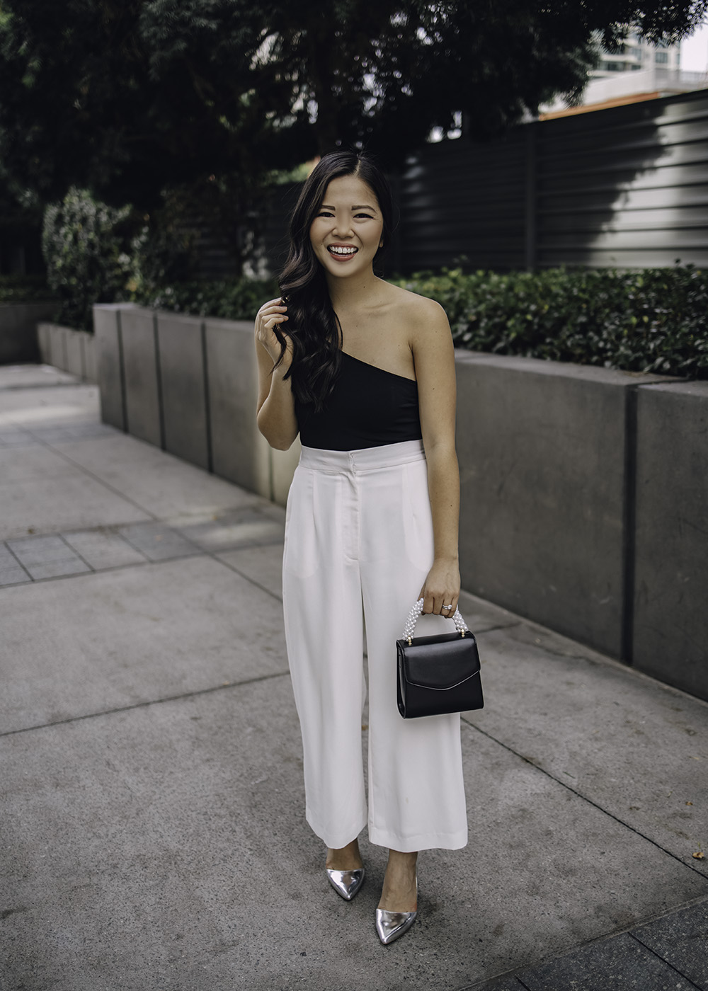 Left: Black One Shoulder Bodysuit (only $29) / White Wide Leg Pants / Silver Pumps / Black Purse with Faux Pearl Handle / Right: Dark Green Cropped Sweater / White Wide Leg Pants / Gucci Marmont Wallet on Chain / Black Suede Pumps