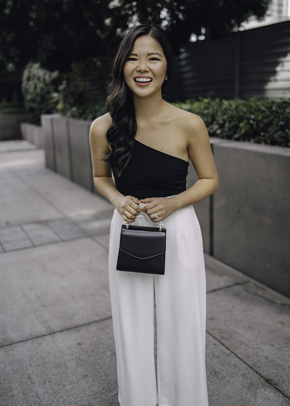 I’ve never really followed the “no white after Labor Day” rule – after all, it’s in my blog name to break the rules! In fact, I think wearing white pants in the winter is like a fresh of breath air. It looks clean and crisp against the texture of this forest green sweater and elevated when paired with this black one shoulder bodysuit (makes for chic New Years Eve outfit!).