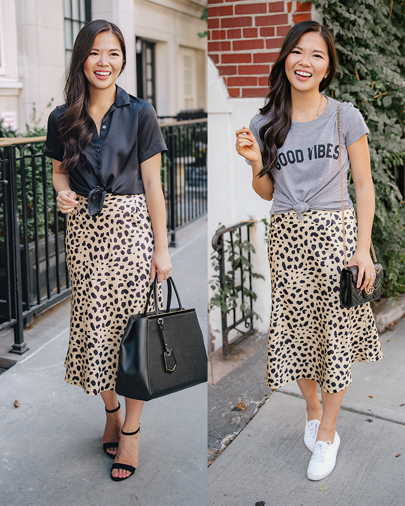 Left: Black Satin ShirtLeopard Midi SkirtPrada 2Jours Shopping Tote / Black Suede Ankle Strap Heels / Right: Good Vibes Graphic Tee (also comes in white) / Leopard Midi Skirt / Gucci Marmont Wallet on Chain / White Sneakers
