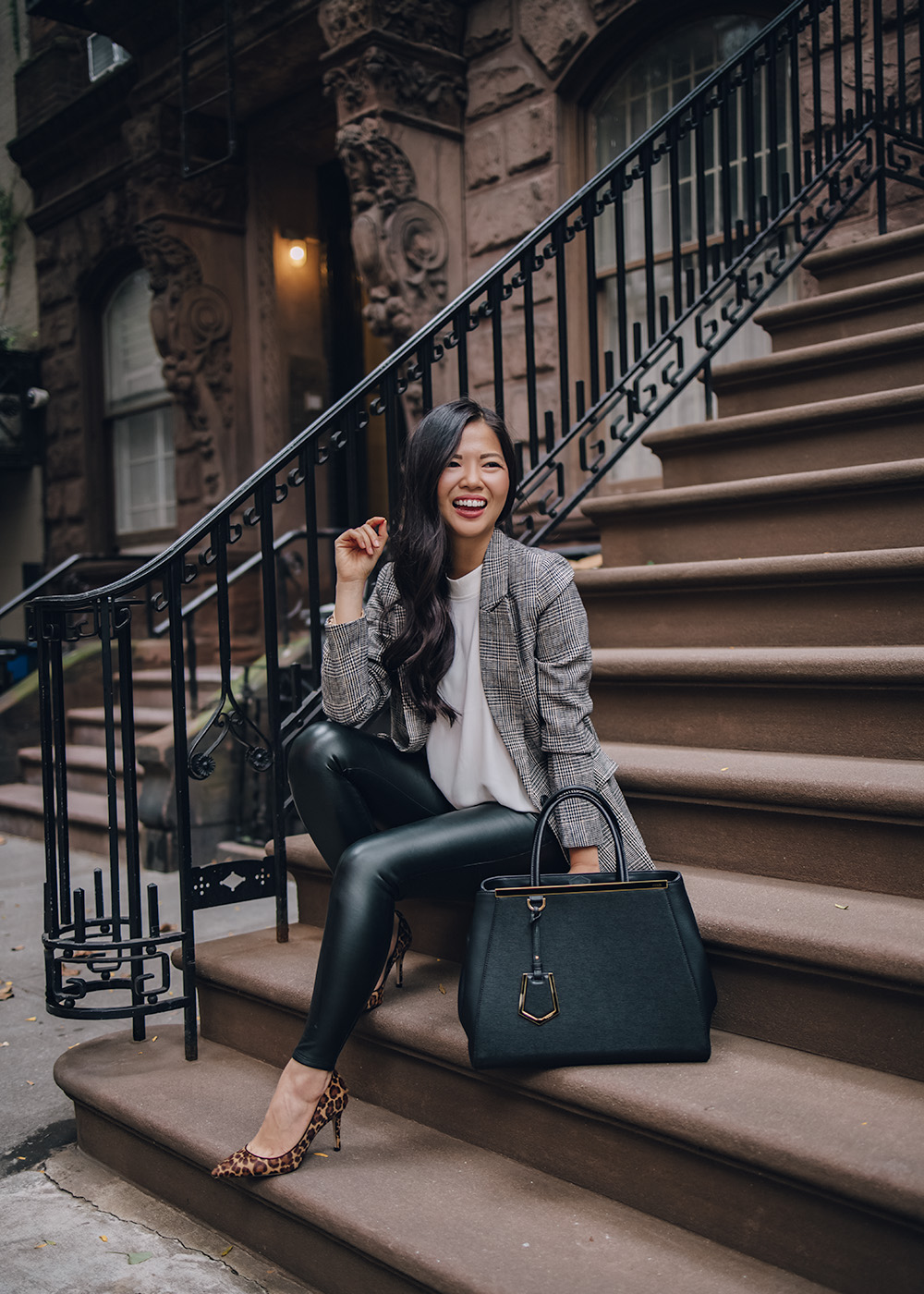 Plaid Blazer / Cream Blouse / Faux Leather Leggings / Fendi 2Jours Tote Bag / Leopard Pumps