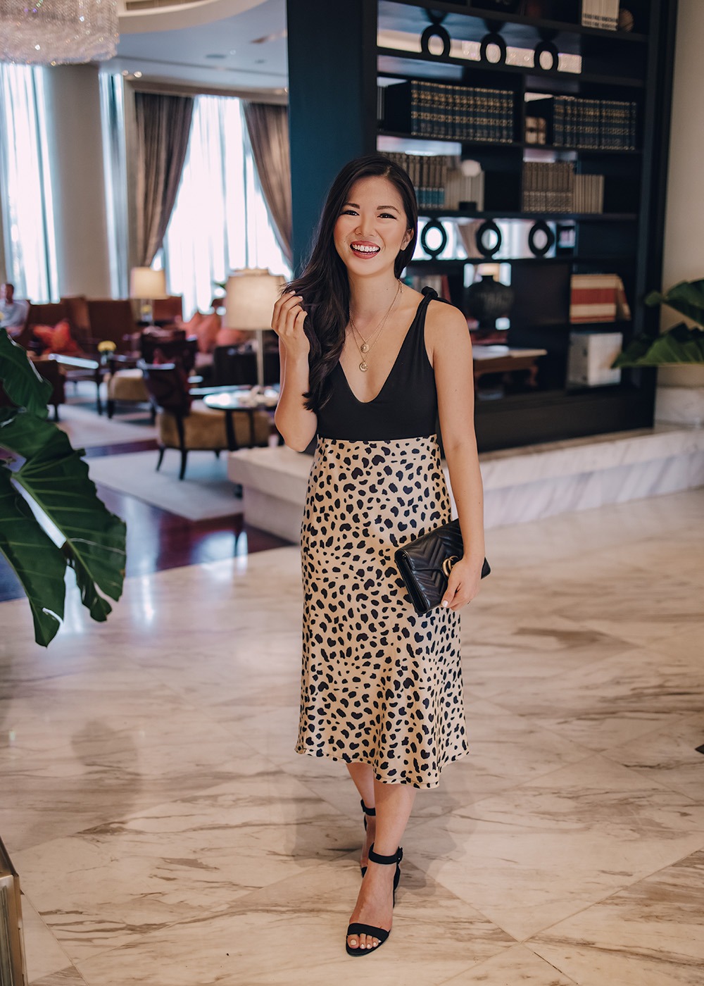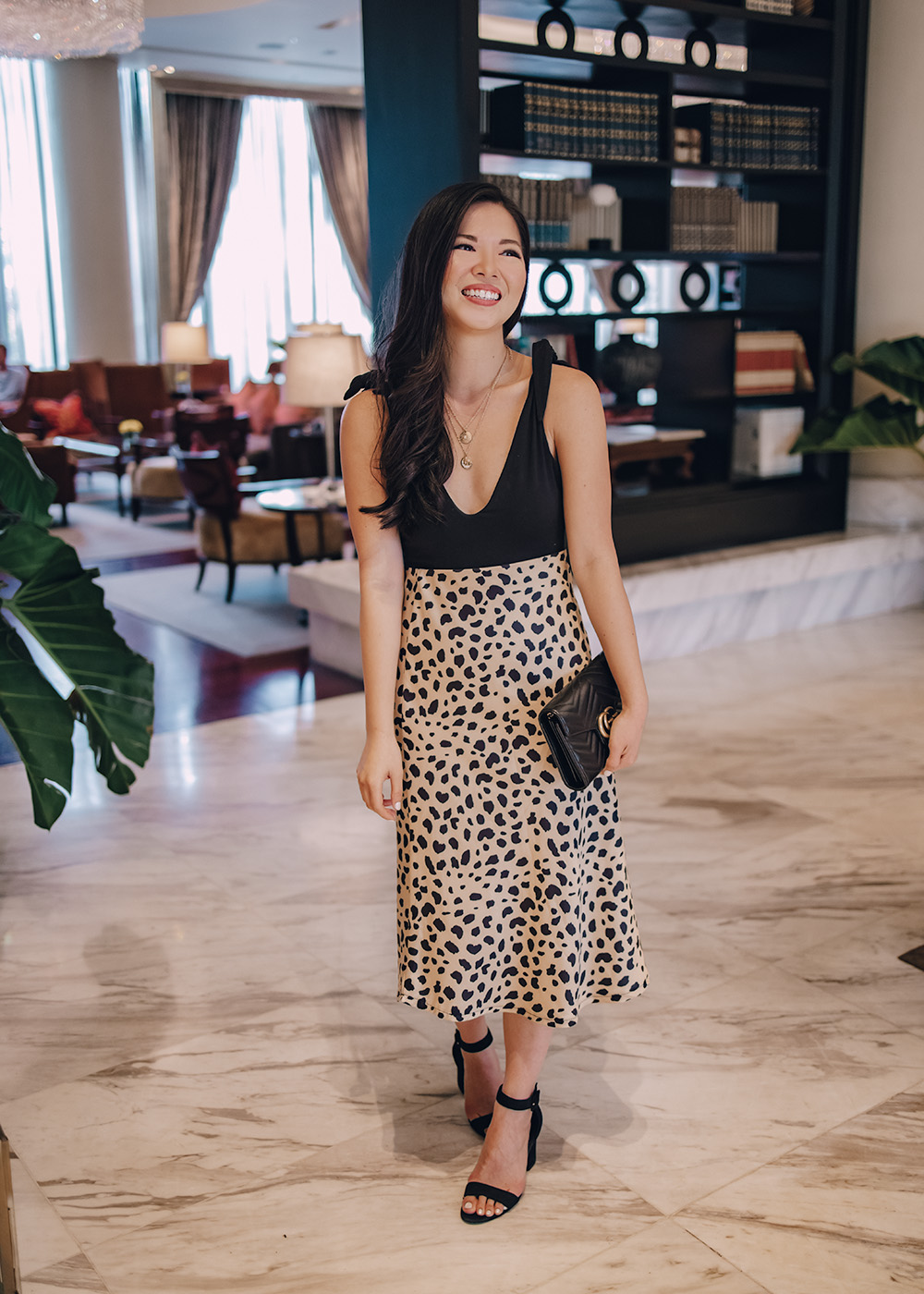 Black Bodysuit (on sale for $35 – I sized up to a medium) / Leopard Satin Midi Skirt / Gold Layered Disc Necklace / Gucci Marmont Wallet on Chain / Black Ankle Strap Block Heel Sandal / Charlotte Tilbury Lipstick in ‘Pillow Talk’