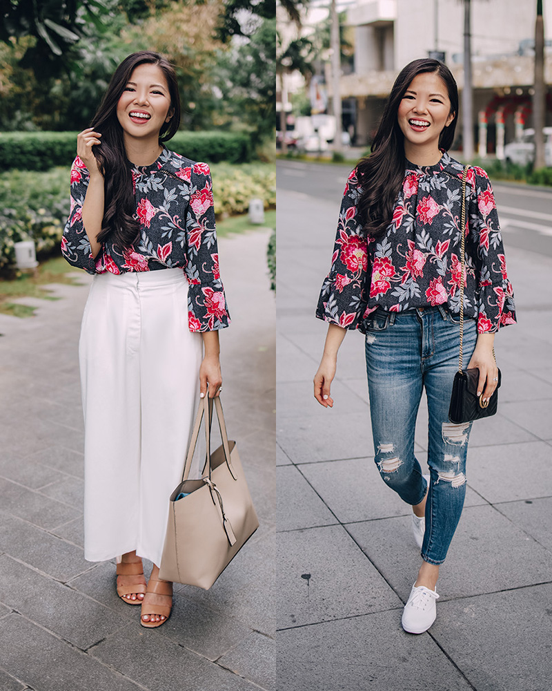 I picked up this floral top from LOFT right before we left for our Asia trip. Worn with ripped jeans and comfy white sneakers, and it’s perfect for a day of exploring. Pair it with white wide legged pants and it’s an office-appropriate outfit for that post-vacay grind. Which one is your favorite look?