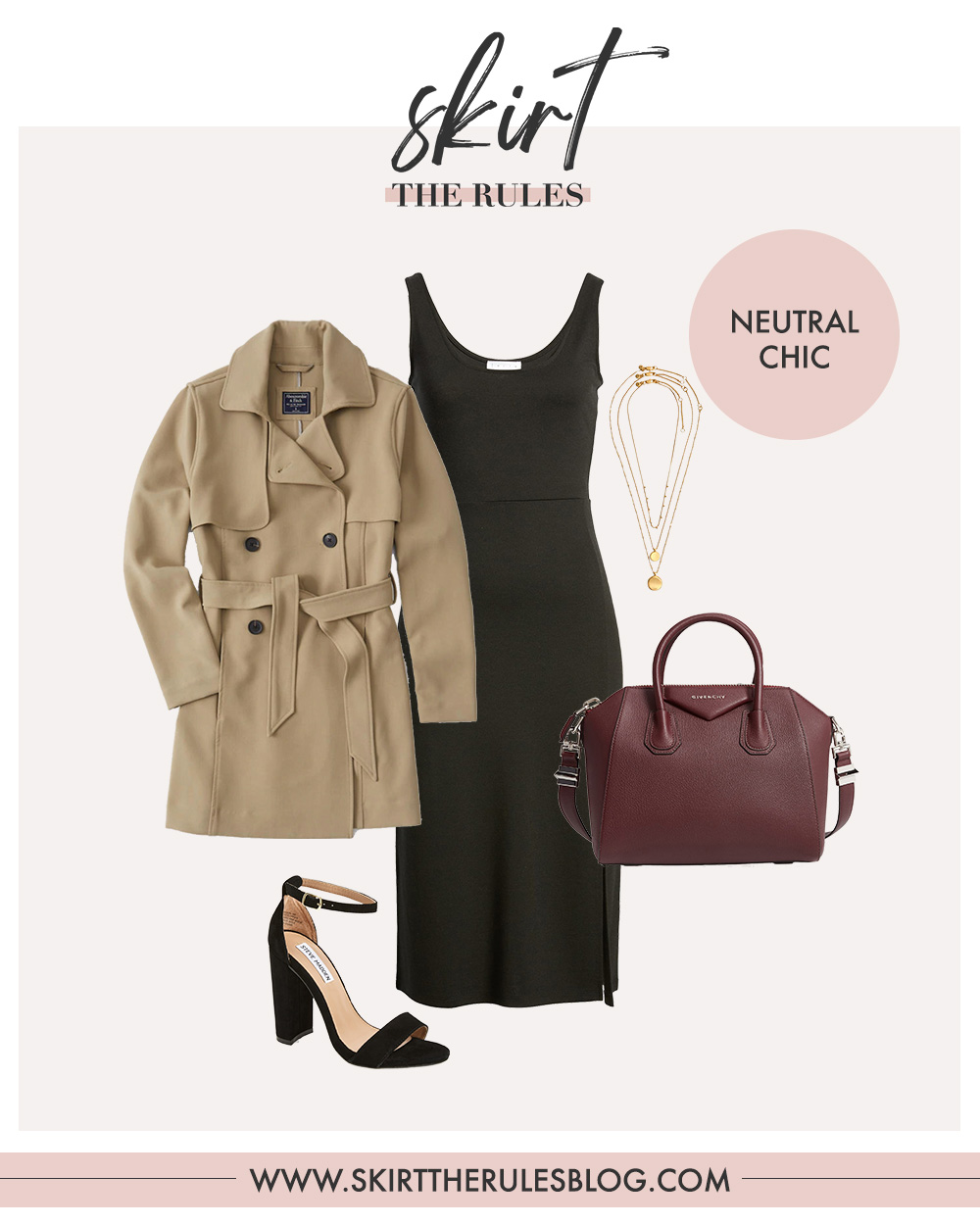 Trench Coat / Black Dress with Slit / Gold Layered Necklaces / Givenchy Antigona Bag / Black Suede Ankle Strap Heels