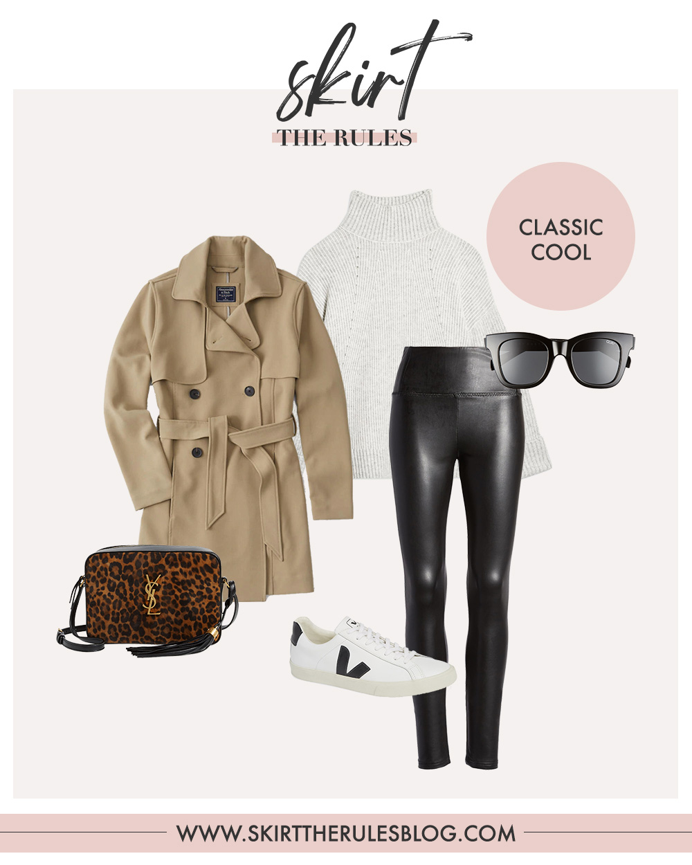 Trench Coat / Grey Sweater / Faux Leather Leggings / Black Sunglasses / Saint Laurent Camera Bag / Veja V-10 Sneakers