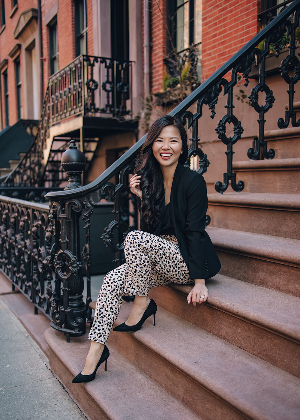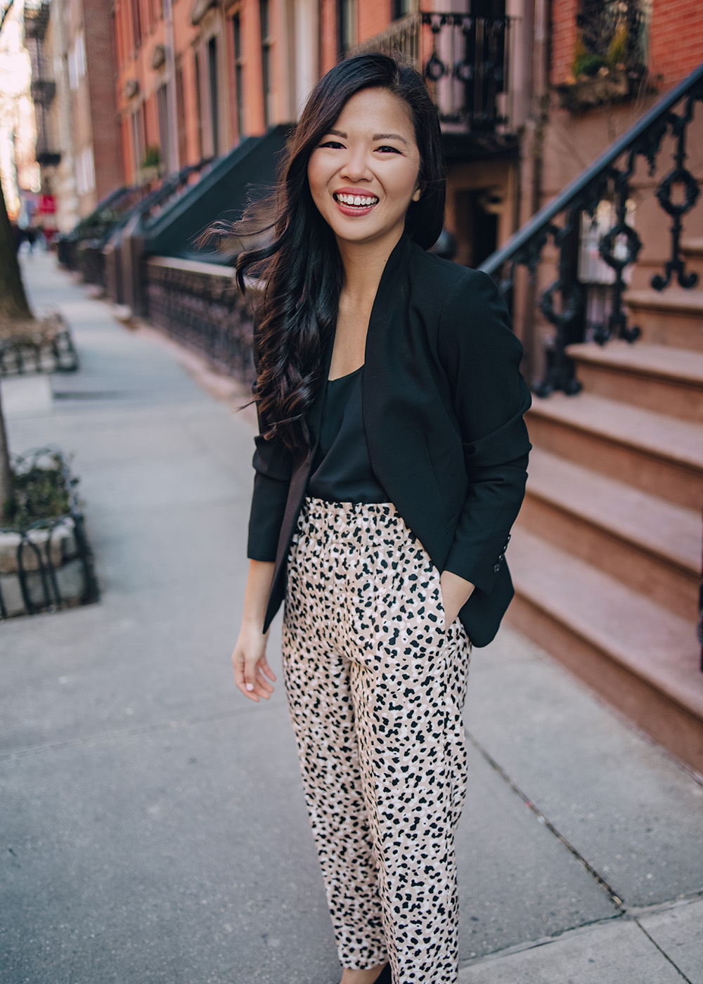 Black Collarless Blazer (XSP) / Black Tank (XS) / Leopard Pants (0R) / Black Suede Pumps (6.5) – all c/o of Ann Taylor