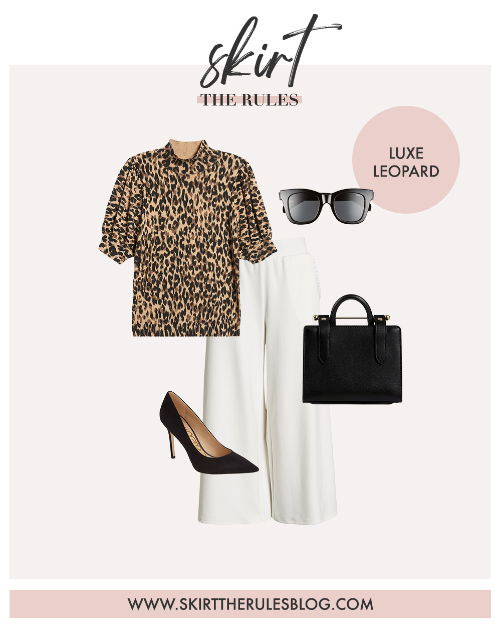 Leopard Short Sleeve Sweater / Black Sunglasses / Strathberry Mini Allegro Tote / White Wide Leg Pants / Black Suede Pumps