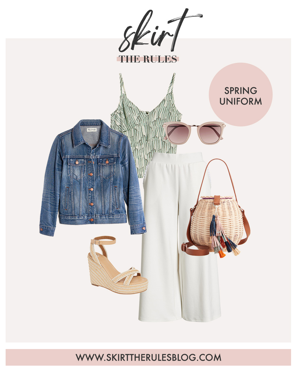 Denim Jacket / Printed Ruffle Cami / Pink Sunglasses / White Wide Leg Pants / Straw Bag with Tassels / Woven Wedge Sandal