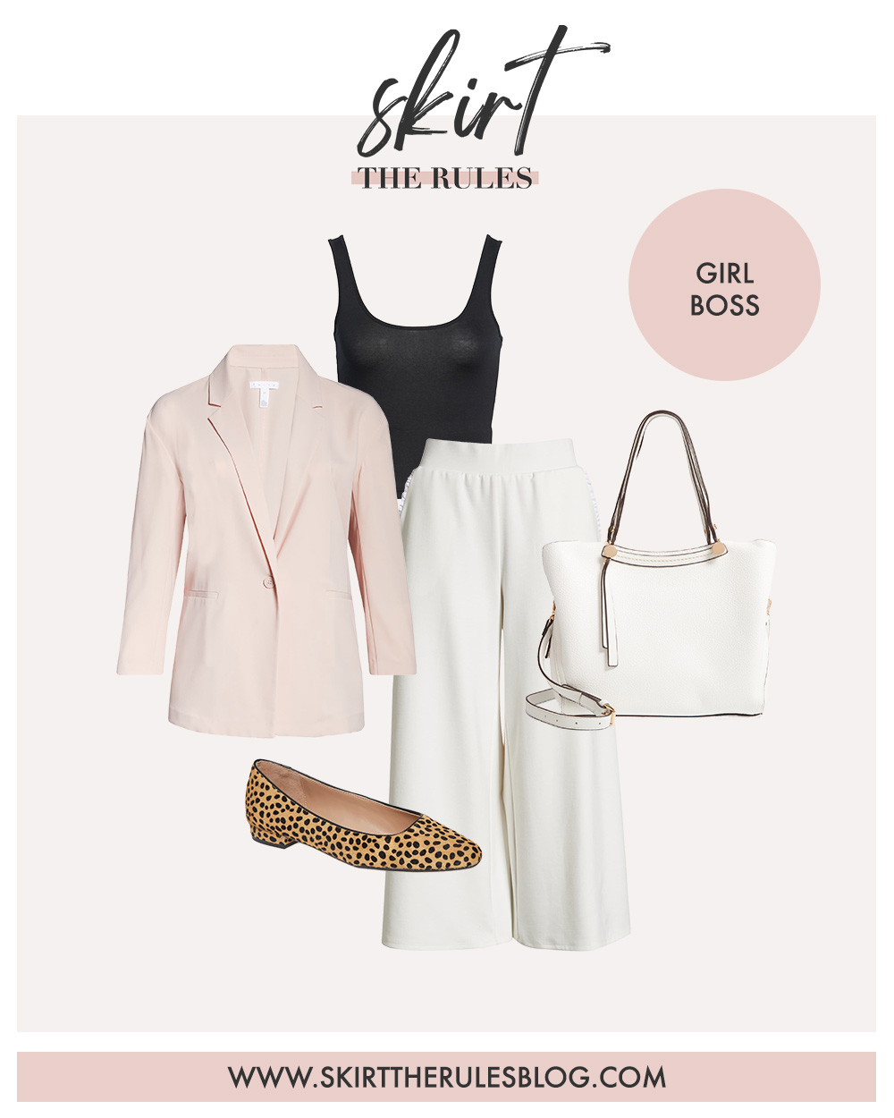 Pink Blazer / Black Tank Top (only $10) / White Faux Leather Tote Bag / White Wide Leg Pants / Leopard Flats