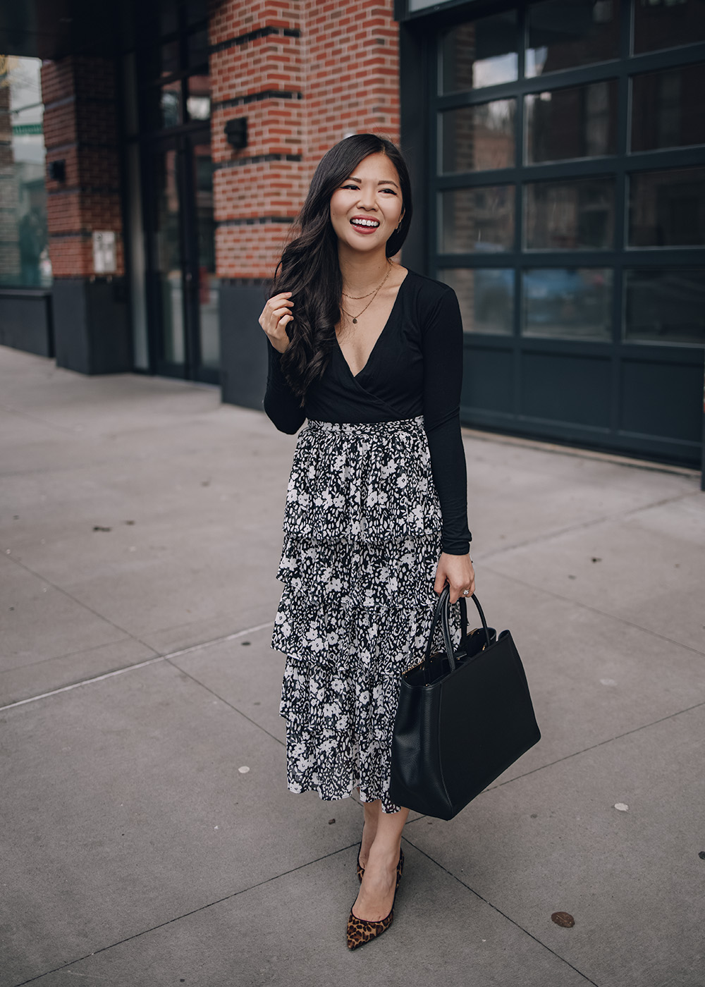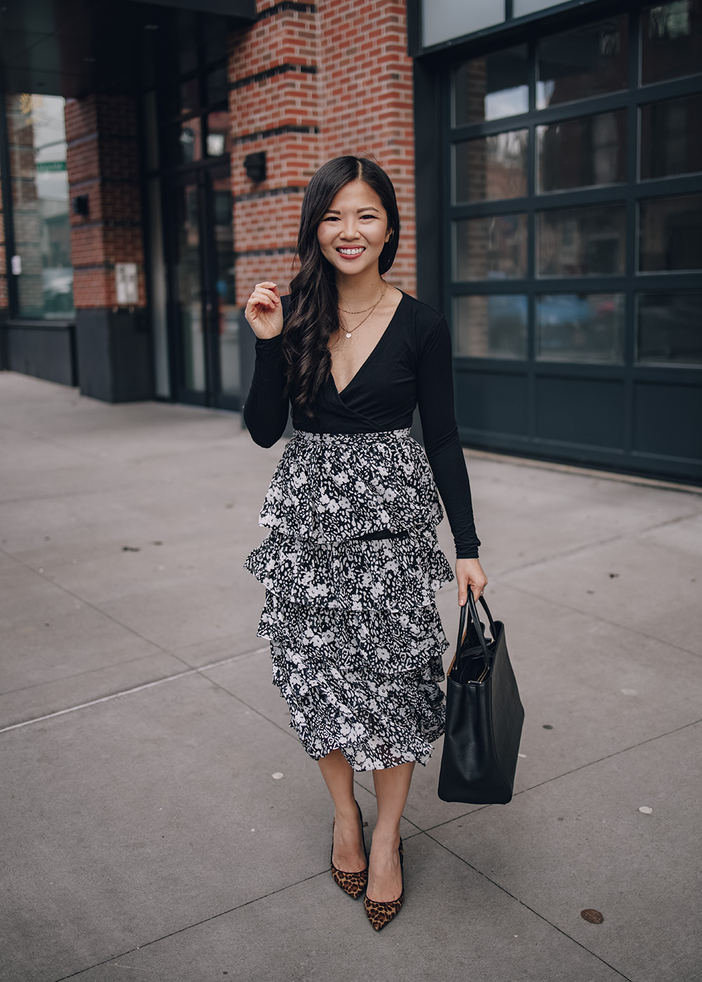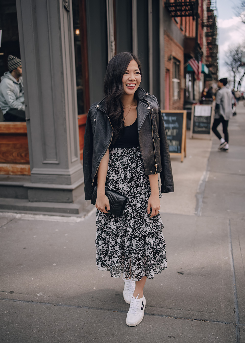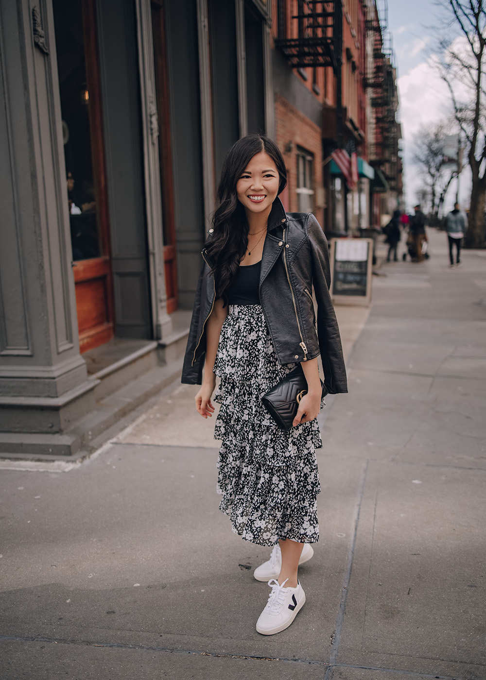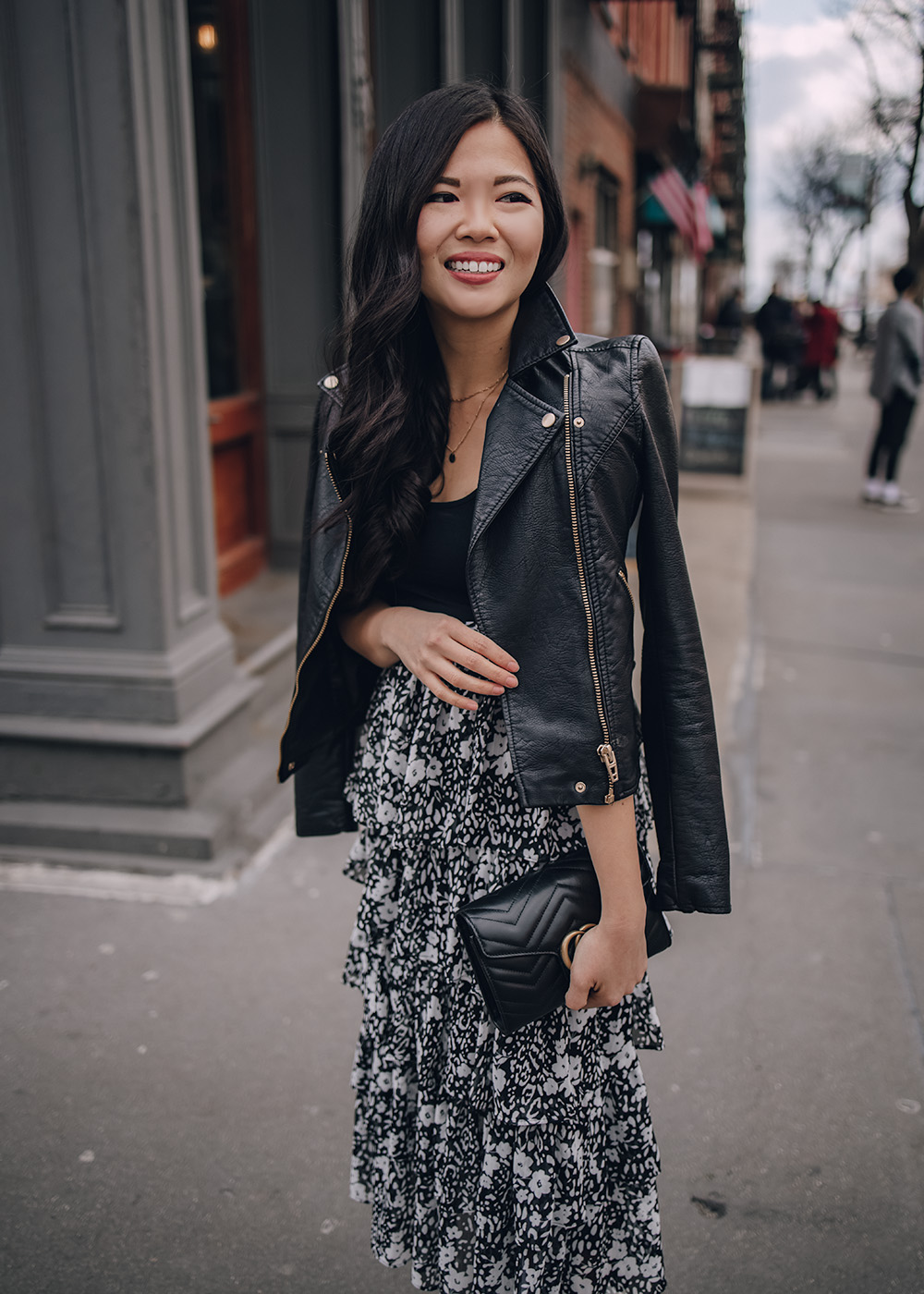 Left: Faux Leather Moto Jacket / Black Tank Top (only $10) / Ruffle Floral Midi Skirt (also comes in leopard and teal) / Gucci Marmont Wallet on Chain / Veja V-10 Sneakers / Right: Black Bodysuit / Ruffle Floral Midi Skirt / Fendi 2Jours Tote Bag (similar black tote) / Leopard Pumps