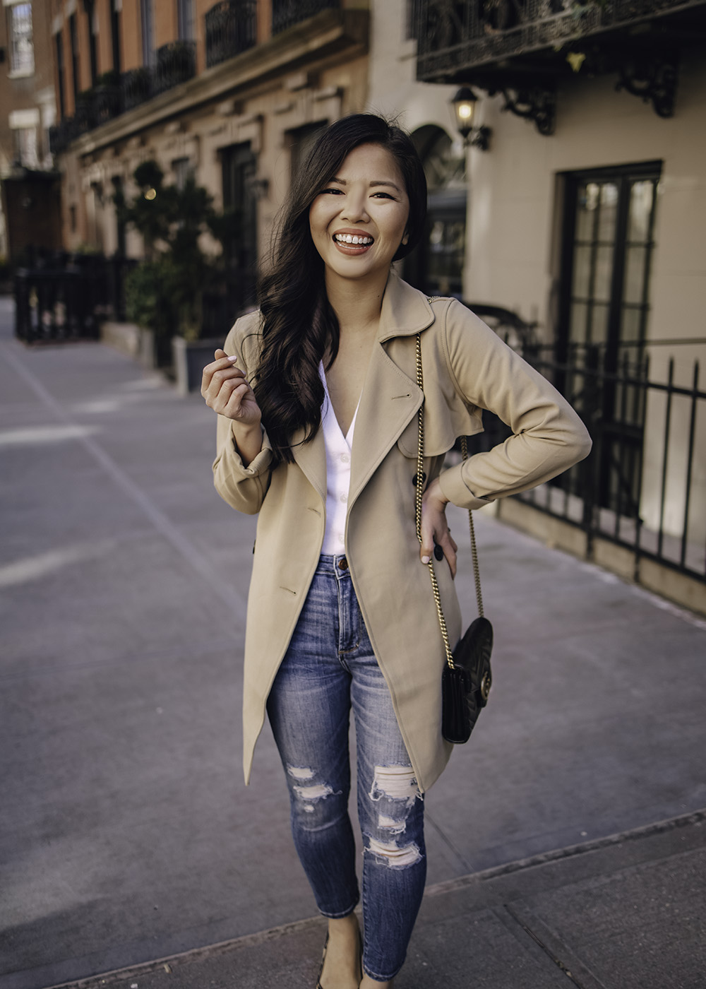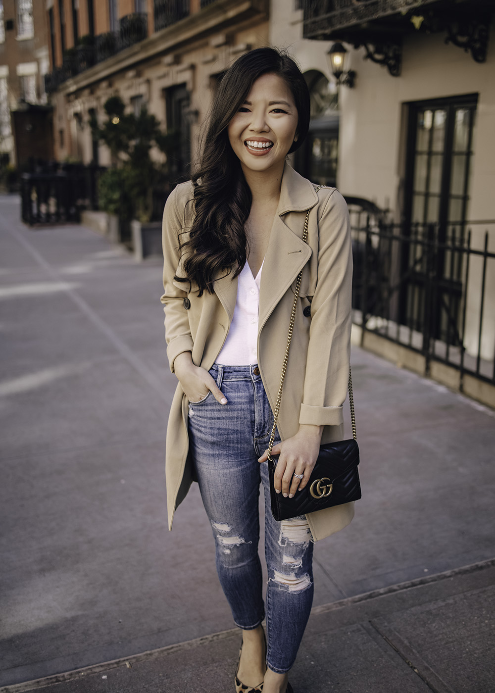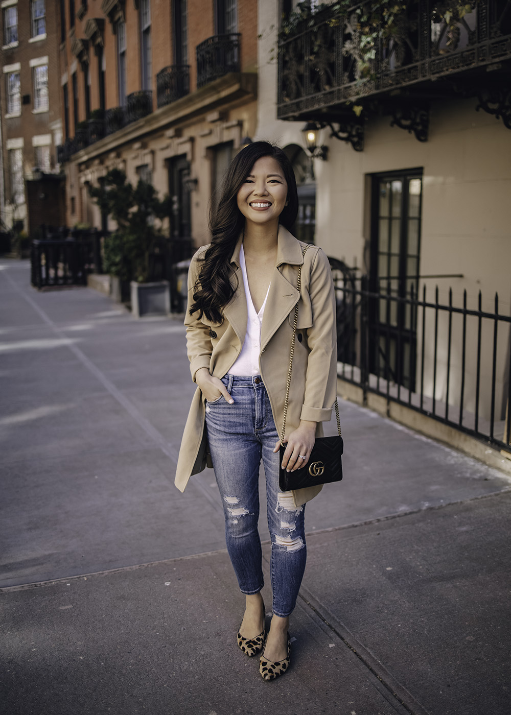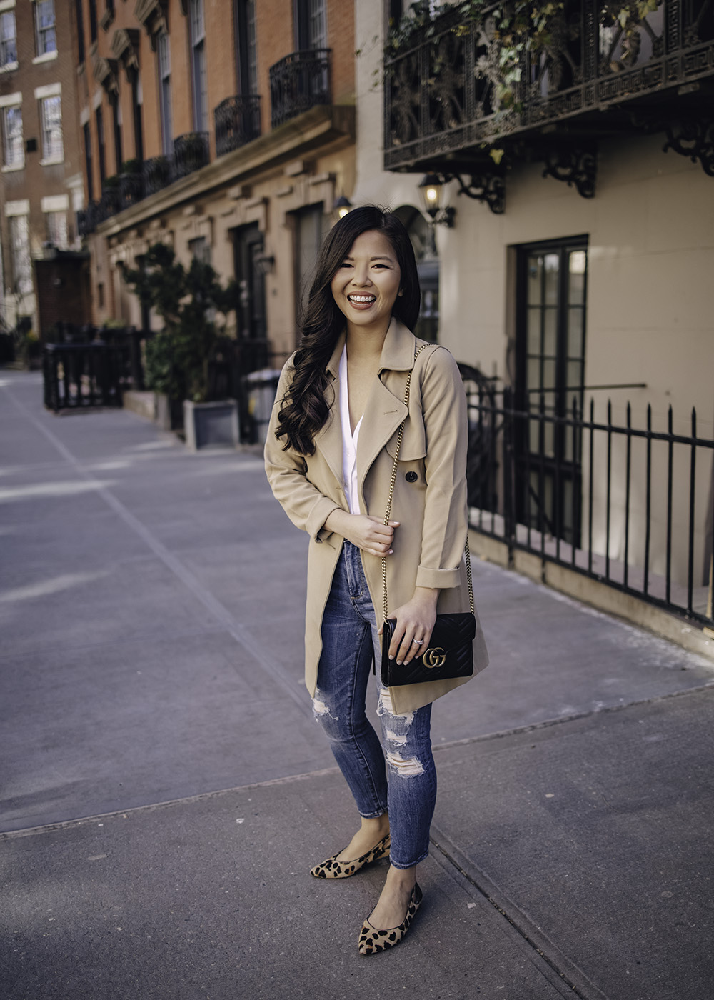 Camel Trench Coat (XS – light brown) / White Cardigan Sweater (XS) / High Waisted Ripped Skinny Jeans / Gucci Marmont Wallet on Chain / Leopard Flats / Charlotte Tilbury Lipstick in ‘Pillow Talk’