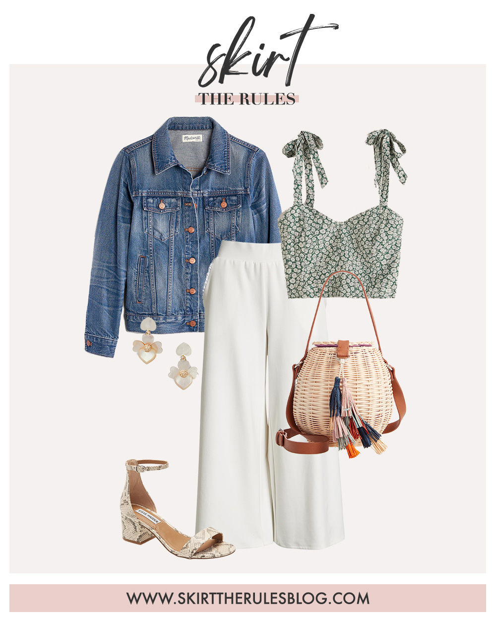 Floral Top with Tie Straps / Denim Jacket / White Floral Earrings / Wicker Bucket Bag with Tassels / Snakeskin Ankle Strap Block Heel Sandals