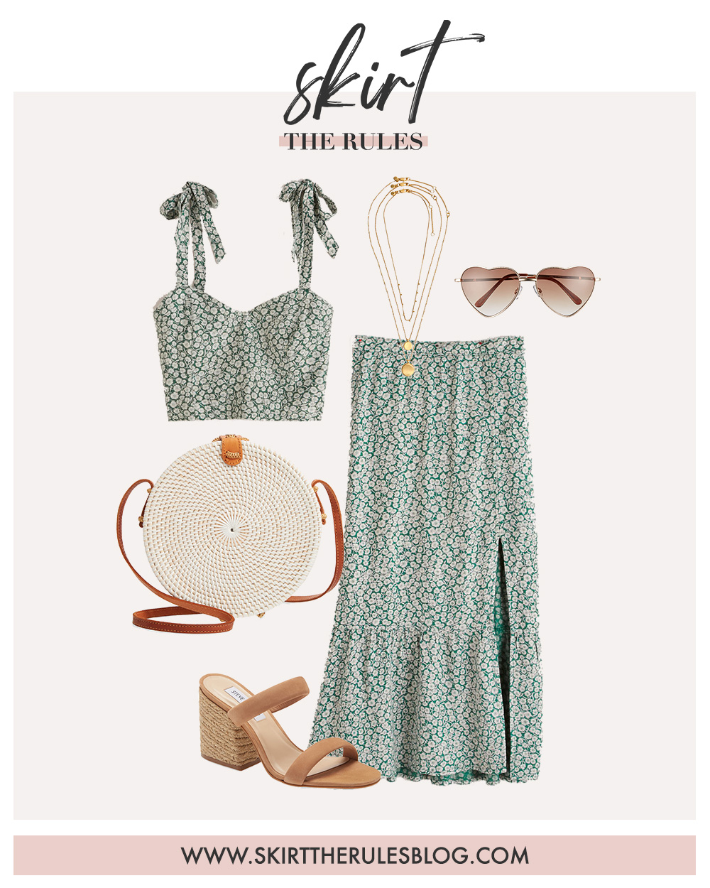 Floral Top with Tie Straps / Floral Midi Skirt with Slit / Gold Layered Necklace / Heart Sunglasses / Straw Circle Bag / Espadrille Mules