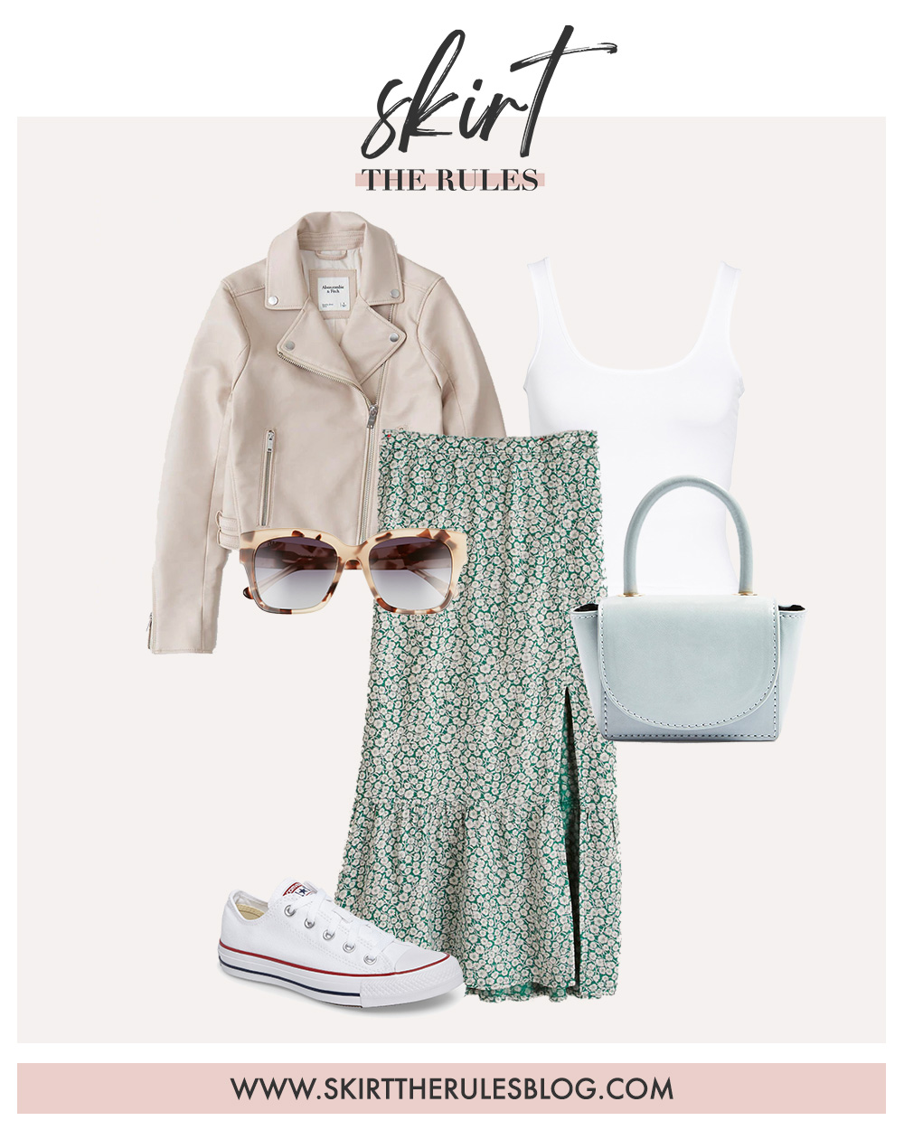 Faux Leather Moto Jacket / White Tank Top / Floral Midi Skirt with Slit / Cream Tortoise Sunglasses / Light Blue Purse / White Converse Chuck Taylor Sneakers