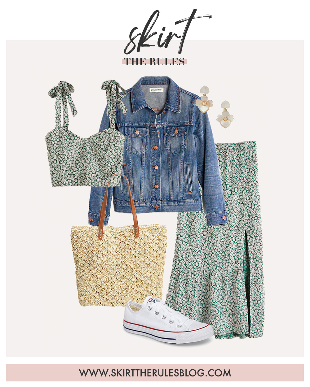 Floral Top with Tie Straps / Floral Midi Skirt with Slit / Denim Jacket / Pearl Floral Earrings / Straw Tote Bag / White Converse Chuck Taylor Sneakers