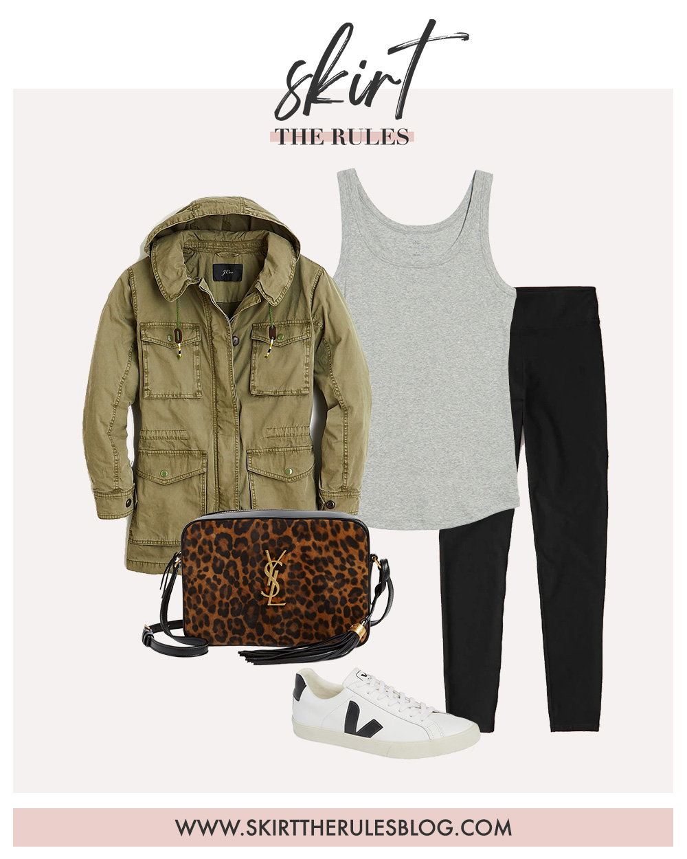 Green Utility Jacket / Grey Tank Top / Leopard Saint Laurent Crossbody Bag / High Waisted Black Leggings / Veja V-10 Sneakers