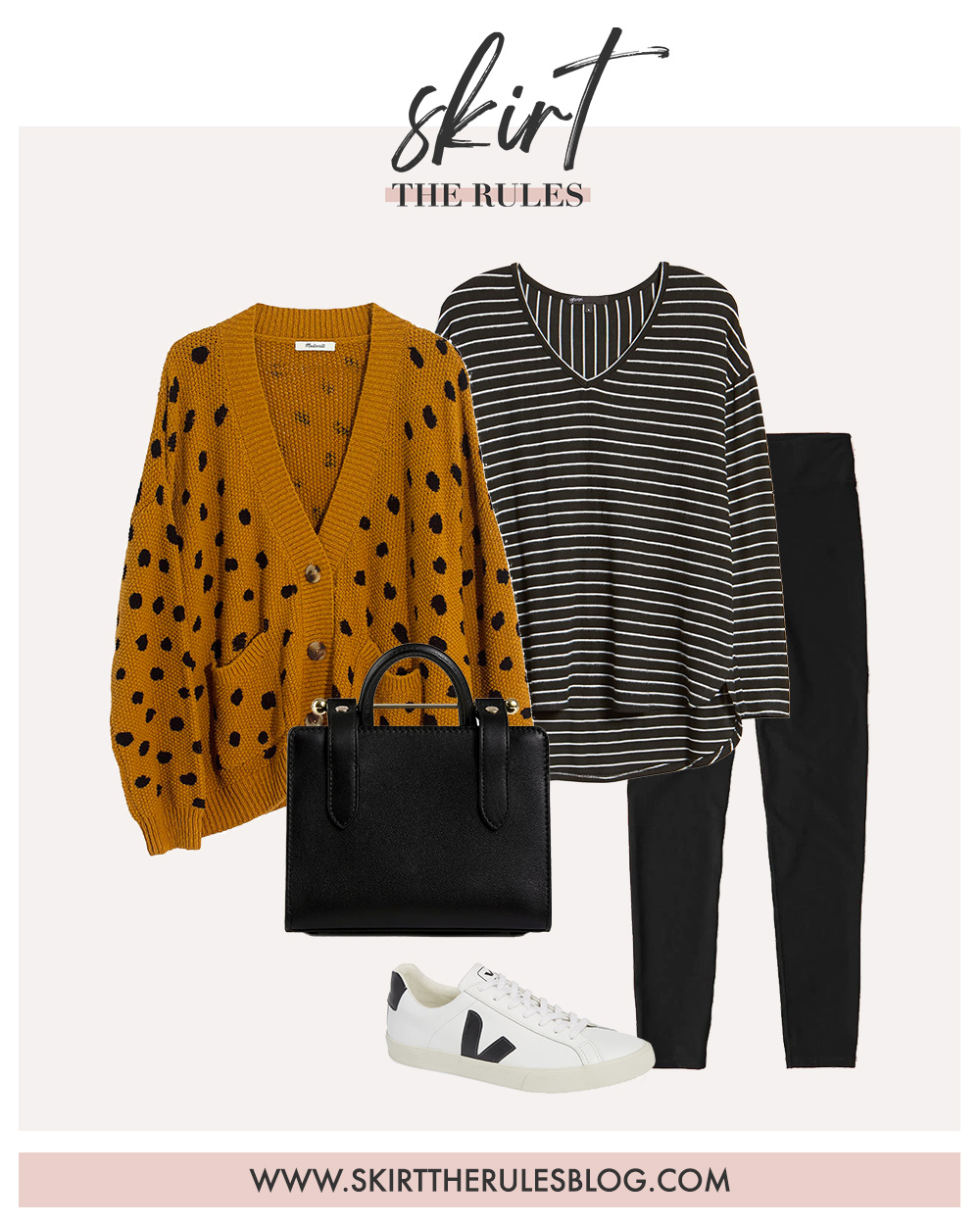 Cheetah Print Cardigan (also available here) / Black & White Striped Long Sleeve T-Shirt / High Waisted Black Leggings / Black Mini Bag / Veja V-10 Sneakers
