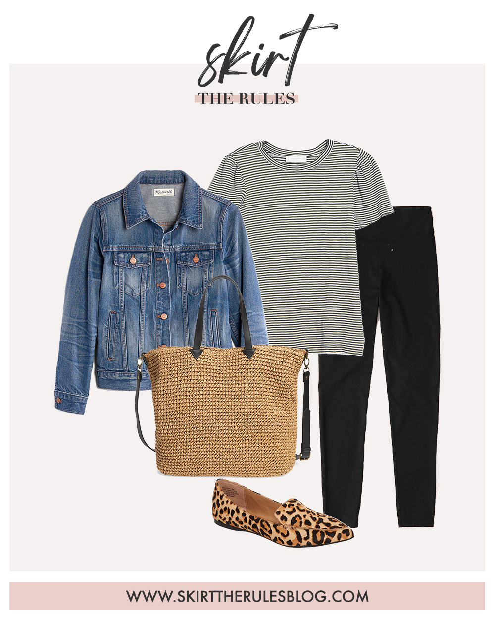 Denim Jacket / Black & White Striped T-Shirt / Straw Tote Bag / High Waisted Black Leggings / Leopard Loafers