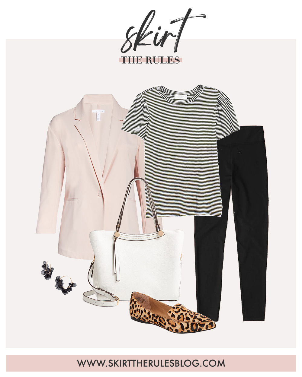 Pale Pink Blazer / Black & White Striped T-Shirt / Black Petal Hoop Earrings / White Leather Tote Bag / High Waisted Black Leggings / Leopard Loafers