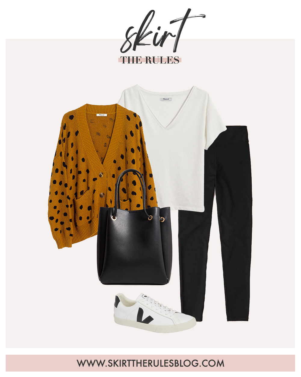 Cheetah Print Cardigan (also available here) / White V-Neck T-Shirt / High Waisted Black Leggings / Black Tote Bag / Veja V-10 Sneakers