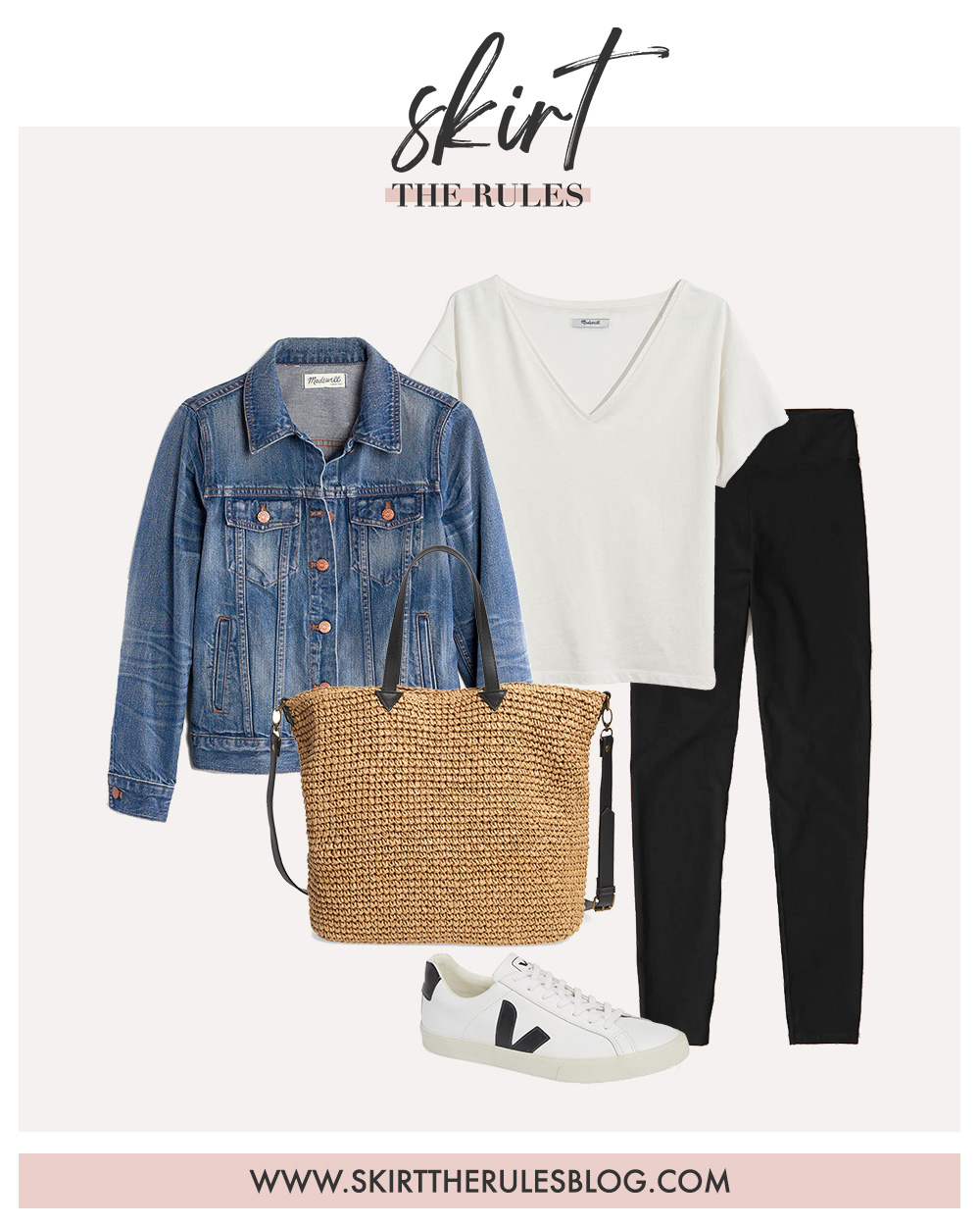 Denim Jacket / White V-Neck T-Shirt / Straw Tote Bag / High Waisted Black Leggings / Veja V-10 Sneakers