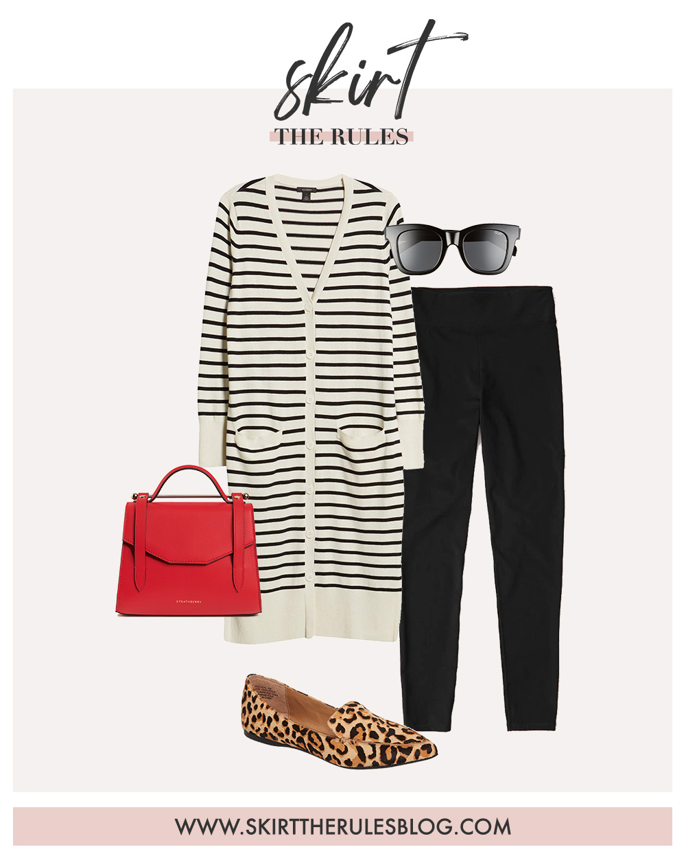 Long Black & White Striped Cardigan / Red Mini Bag / Black Oversized Sunglasses / High Waisted Black Leggings / Leopard Loafers