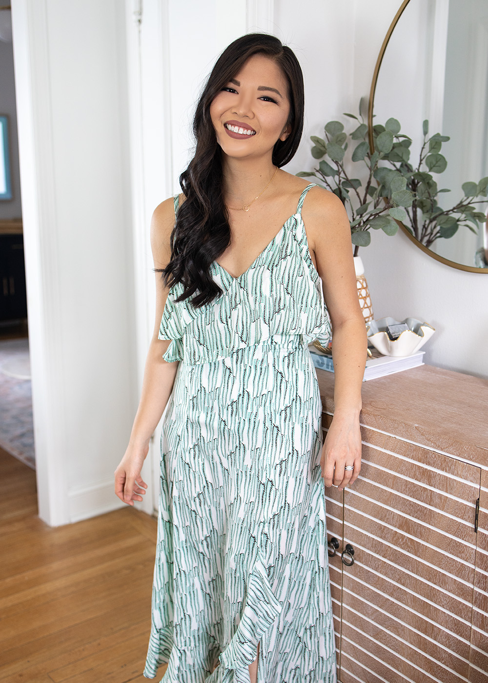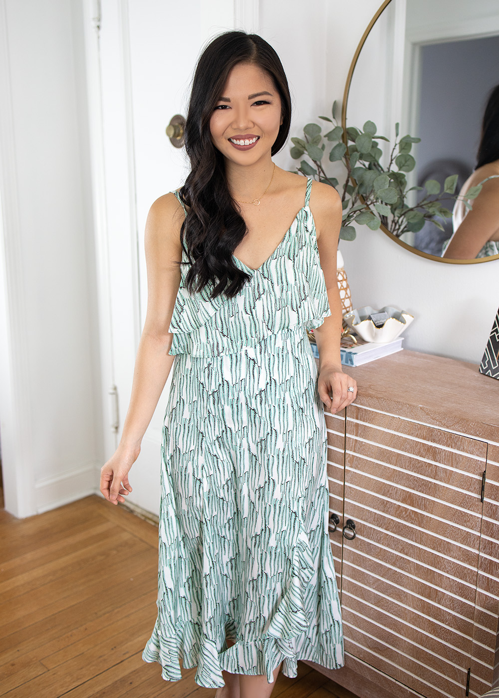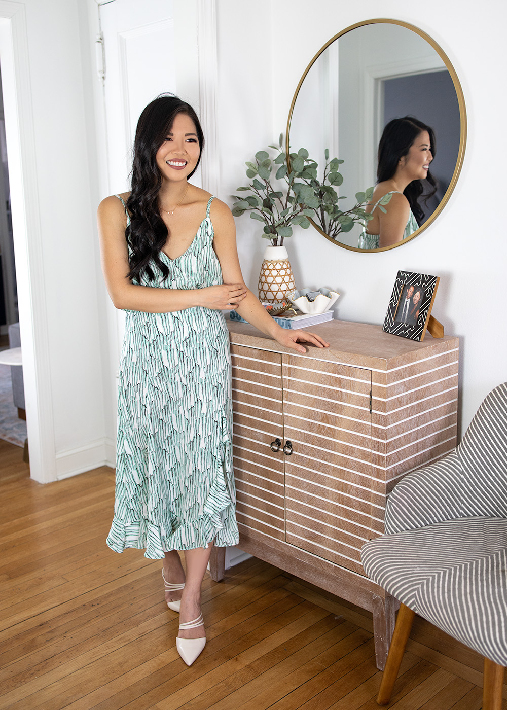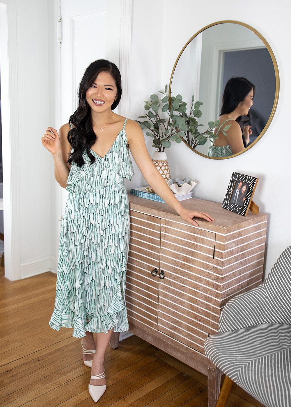 Outfit: Mint Ruffle Camisole (size 2 – on sale for $22) / Mint Ruffle Midi Skirt (size 4 – on sale for $35) / Gold Circle Necklace / Ivory Mule Pumps (c/o) / Decor: Gold Circle Mirror / Eucalyptus Branches / Woven Vase / Surf Shack Coffee Table Book / Striped Console