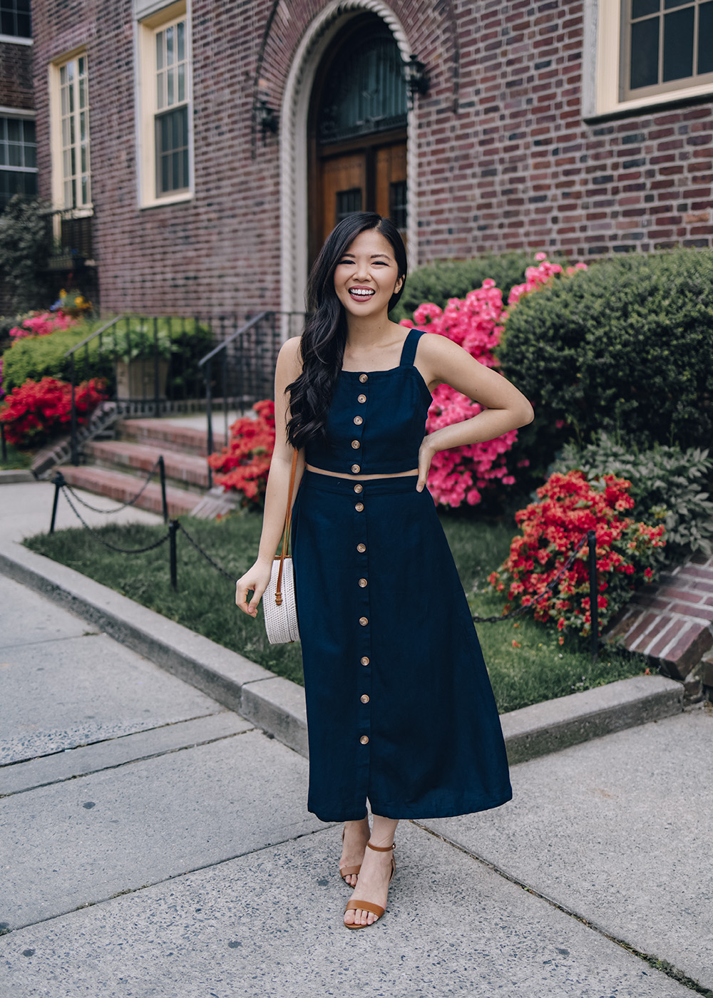 Matching Set: Navy Crop Top & Midi Skirt with Buttons