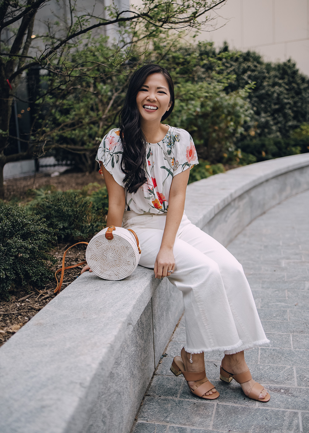 White Floral Blouse (XS) / White High Waisted Wide Leg Jeans (XSR) / White Straw Circle Bag / Tan Leather Mule Sandals / Charlotte Tilbury Matte Lipstick in ‘Pillow Talk’