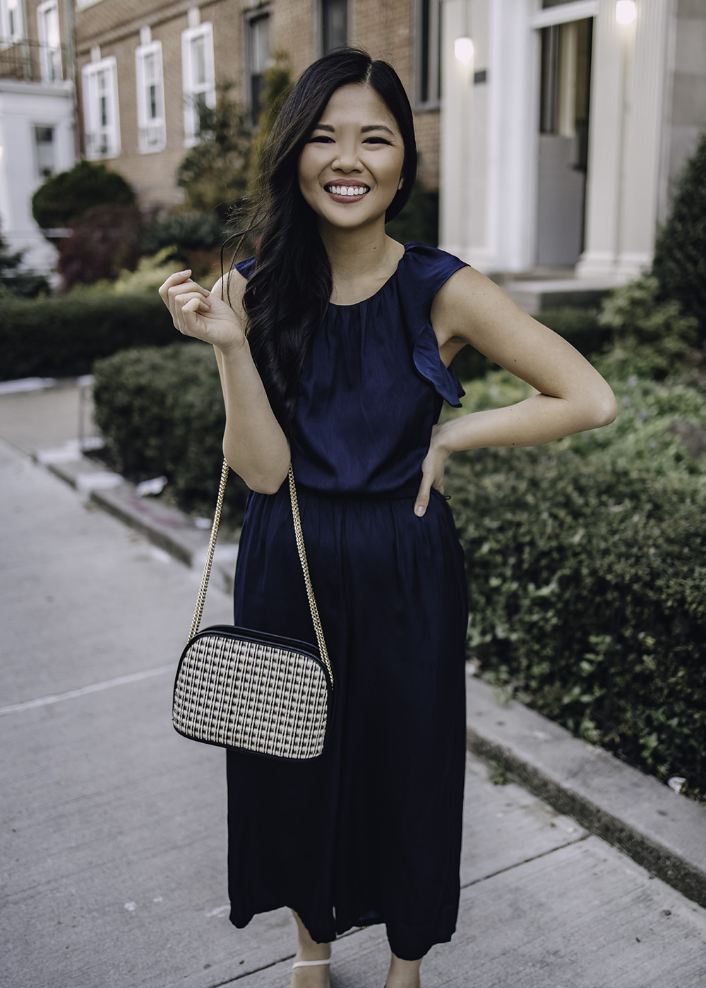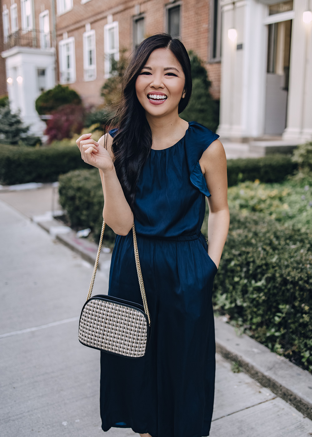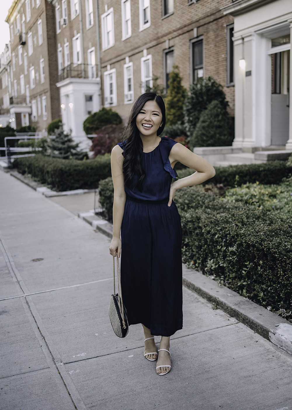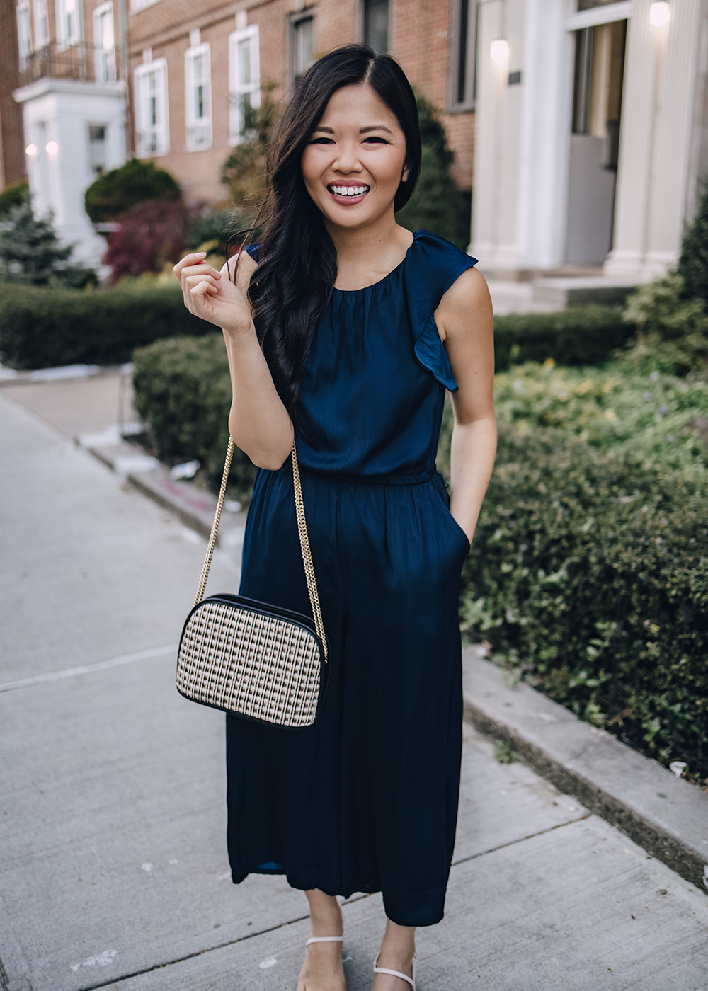 You know I love an easy outfit and it really doesn’t get much easier than this navy jumpsuit. Thanks to the rich color, the satin-like fabric and the ruffle sleeves, it feels very put together – without the fuss. These days, especially on Mondays, I’ll wear anything that looks dressed up, but feels like pajamas.