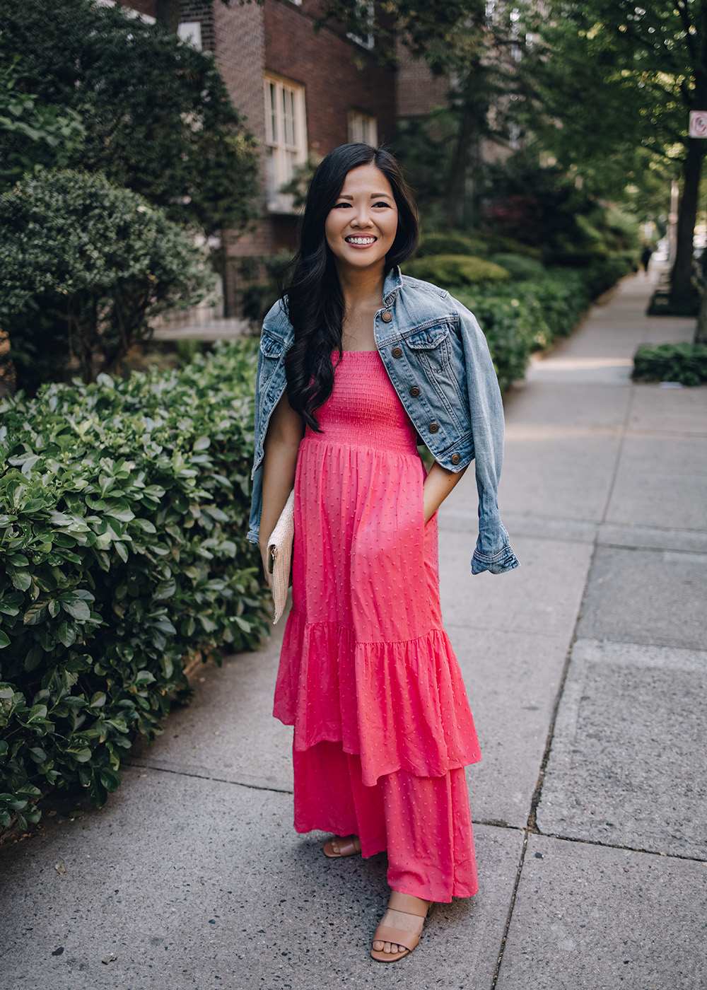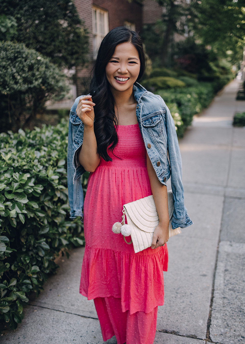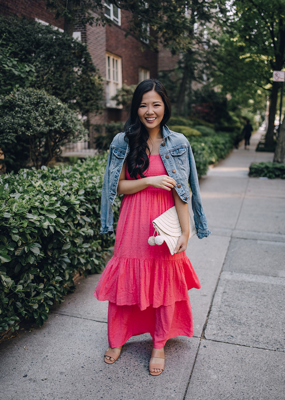 Denim Jacket / Coral Maxi Dress / Straw Clutch / Tan Leather Mules / Charlotte Tilbury Matte Lipstick in ‘Pillow Talk’