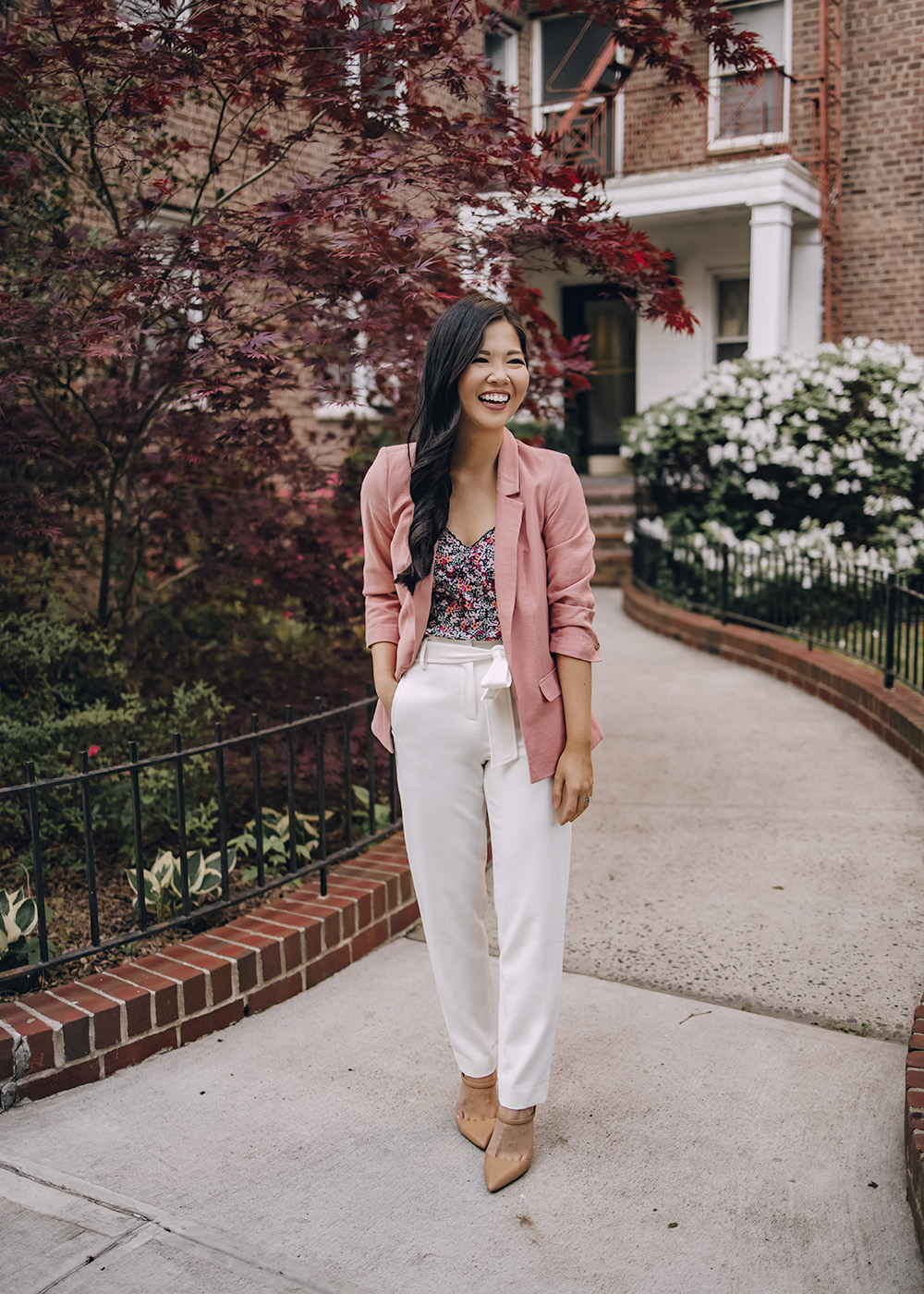 So work attire is still very much relevant to me, even though things have been skewing on the casual side in the office (I’ve interacted with the same 4-5 people in person for the past two months – the rest are all virtual). I added this pink blazer to my wardrobe back in February and loved it so much I also got it in khaki. I love the 3/4 sleeves, which I think it super flattering for petites. I love it against a pair of crisp white pants and a pop of floral.