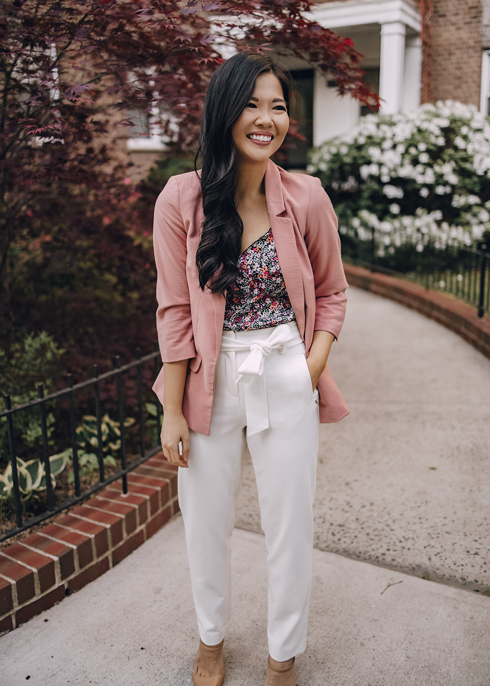 Pink Blazer (0R) / Floral Cami (XS – similar here) / White Tie Waist Pants (0 – similar here) / Nude Mule Pumps (6.5 TTS) / Charlotte Tilbury Matte Lipstick in ‘Pillow Talk’