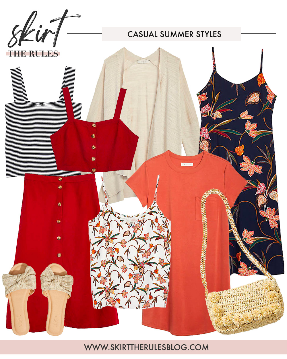 Navy & White Striped Tank / Red Crop Top / Red Midi Skirt / Beige Lightweight Cardigan / Navy & Orange Floral Dress / Burnt Orange T-Shirt Dress / Straw Pom Pom Bag / Orange Floral Cami / Straw Bow Slide Sandals
