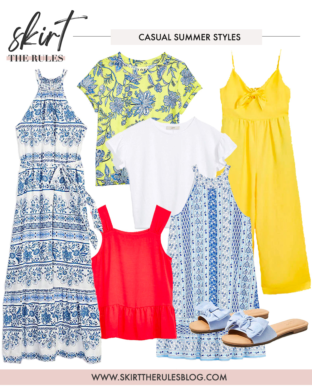 Blue and White Floral Dress / Yellow & Blue Floral T-Shirt / White Ruffle Sleeve Top / Bright Coral Peplum Top / Blue Paisley Dress / Yellow Jumpsuit / Blue Bow Slide Sandals