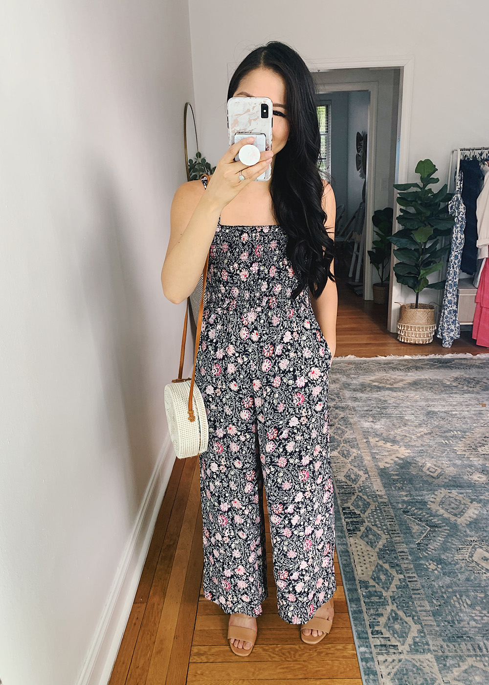Floral Smocked Jumpsuit (XS – selling out fast!) / White Straw Circle Bag / Tan Leather Mules