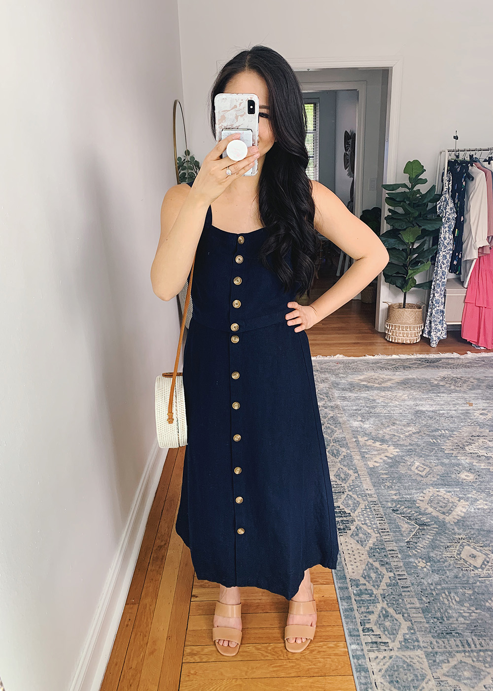 Navy Textured Cami / White Tie Front Jumpsuit / Navy Floral Dress / Navy Square Neck Cami / Textured Shorts / Linen Striped Dress / Olive Green Dress
